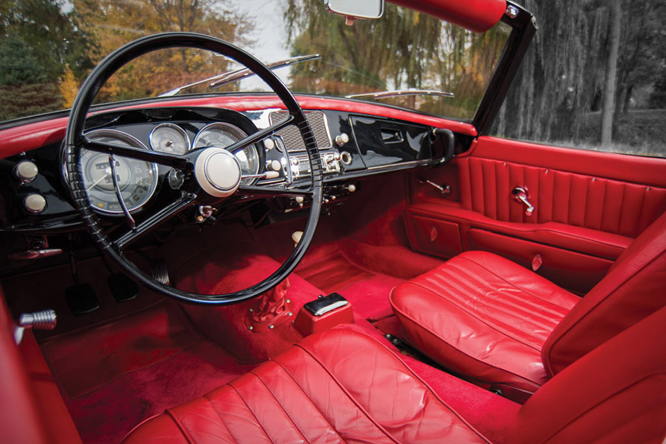 It's not as well-known as its direct competitor, the Mercedes 300SL Roadster, but this 1959 BMW 507 Roadster Series II is no less striking. Penned by Count Albrecht von Goertz, its design shows the influence of his teacher Raymond Loewy, with flowing lines and an overarching sense of grace. One of just 251 built — and of just 217 Series II variants — it's powered by a 3,168 cc 147hp V8 paired to a four-speed manual, and has a bright red interior to contrast with its black exterior.