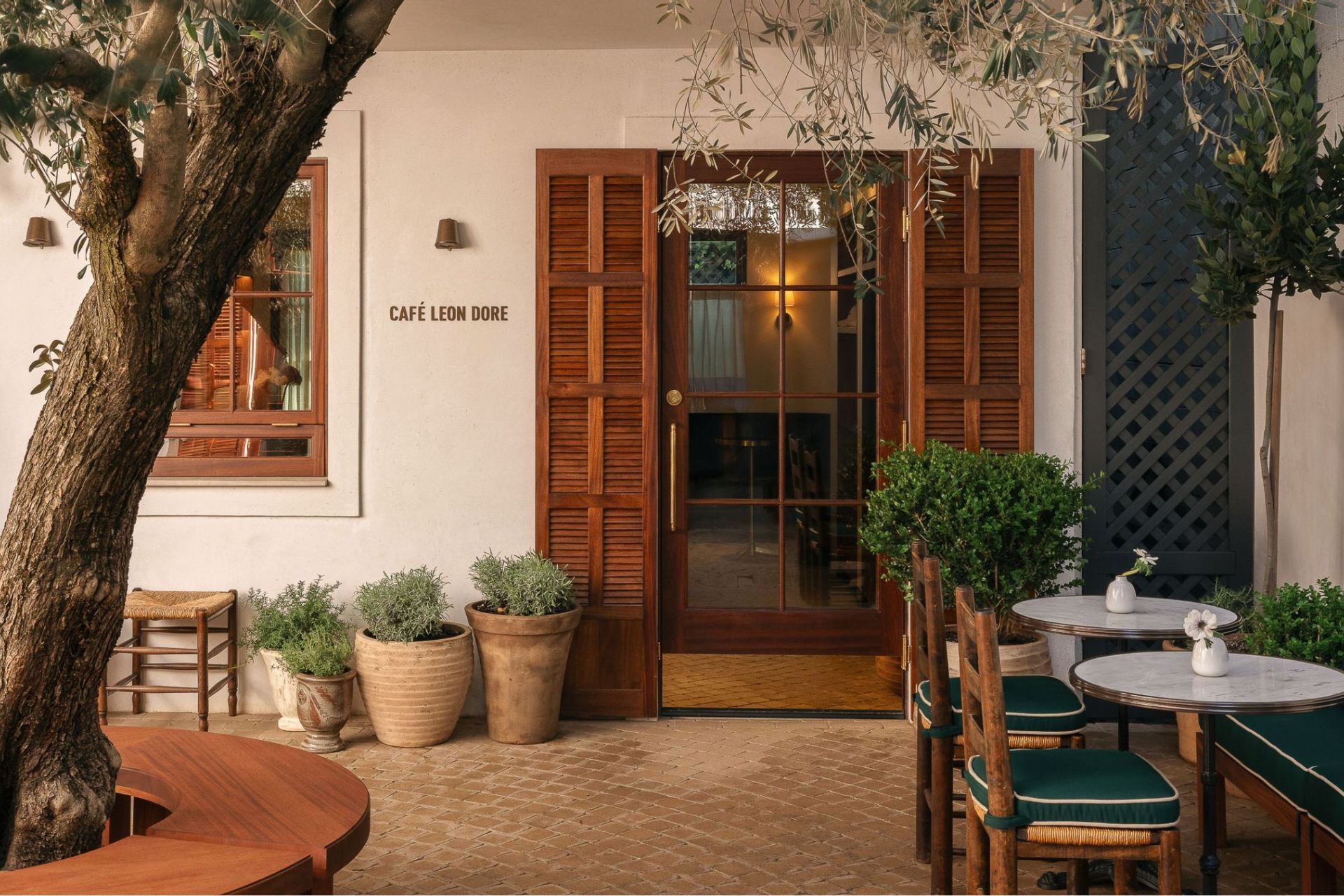 After New York and London, Teddy Santis brings Aimé Leon Dore to Melrose Avenue in West Hollywood, and the store is as sun-drenched and considered as you'd hope. Designed with Sarita Posada Interiors, the space pulls from the texture of old European homes: soft stucco walls, custom wood windows, and a cobblestone courtyard centered on an 80-year-old olive tree sourced from California's Central Valley. Vintage seating, pale gravel, and warm clay tones complete the outdoor space. Inside, the café runs on a custom La Marzocco Linea 2 espresso machine and is finished with deep-green millwork and a marble mosaic with brass motifs by the late Greek painter Alekos Fassianos. A Tyrrell Winston sculpture marks the shop floor. The opening inventory includes the SS26 collection alongside LA-exclusive colorways of the ALD x New Balance 471 and a limited Dodgers Unisphere Tee.