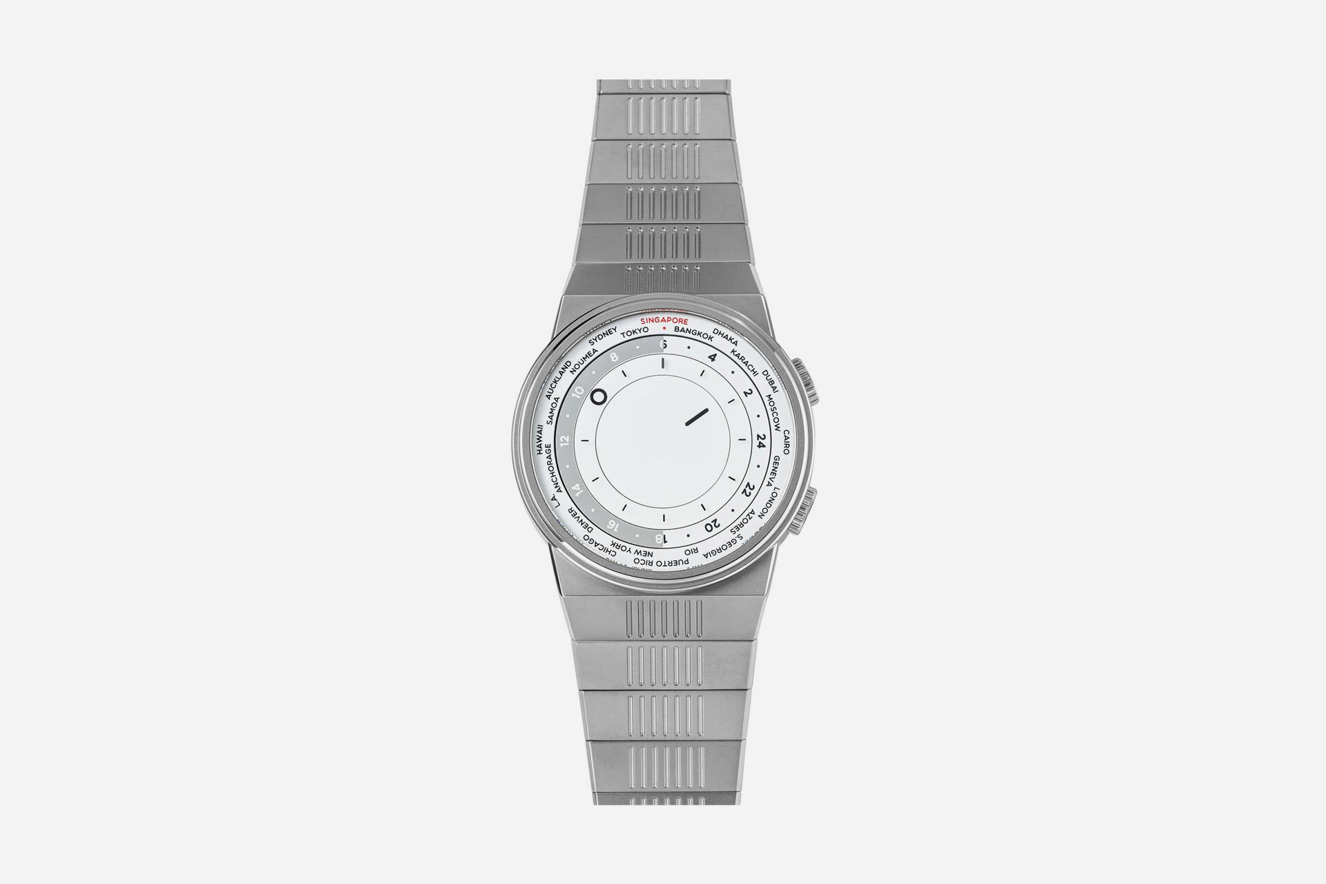 The Alterum Worldtimer Horizon is what happens when you strip a watch down to its purest idea. And then rebuild it smarter. Winner of the inaugural Dubai Watch Week × Grail Watch competition, this final chapter in the Alterum Worldtimer series trades clutter for clarity, ditching traditional hands in favor of four concentric rotating disks that quietly do all the work. Hours, minutes, day/night, and global time zones are all there, wrapped in a crisp white dial with a subtle nod to its origins — "Singapore" marked in red on the city ring. A stepped bezel, recessed twin crowns, and a softly vapor-blasted case and bracelet complete the look. Minimal, modern, and deeply considered, it's a worldtimer that feels genuinely new.