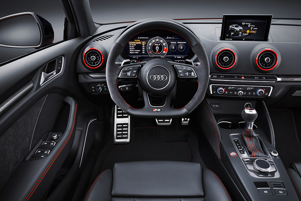 Compact body. Big performance. The Audi RS 3 Sedan packs the world's most powerful five-cylinder engine under its bonnet, with the 2.5L unit producing 400hp. Paired with a seven-speed S-tronic transmission and quattro all-wheel drive, it moves from 0-62 in 4.1 seconds on its way to a top speed of 174 mph. The interior is outfitted in black leather, with optional sport seats, and has all the technology features you'd expect.