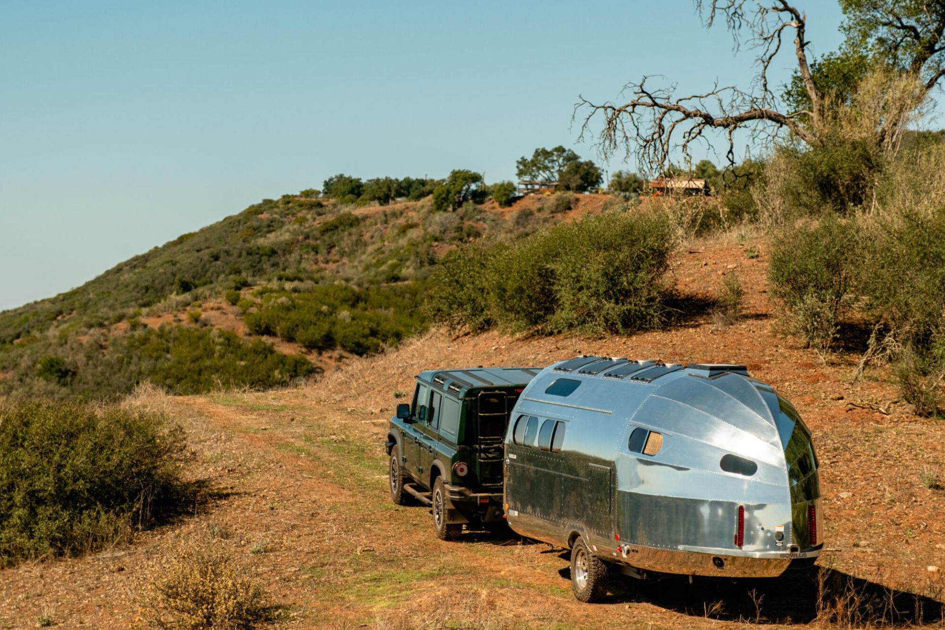 The Bowlus riveted aluminum trailer is built for deep backcountry exploration behind your Scout Traveler. Hand-crafted wood interiors and custom furniture turn remote campsites into luxury basecamp. The Off-Grid Power Package II pairs 400 watts of AeroSolar with a 19-kWh battery for unlimited time in the wilderness. Adventure Package adds a three-inch lift and all-terrain tires for accessing trails that stop most trailers cold. Heated floors, dual skylights, continuous hot water, and an outdoor shower handle comfort from Moab to Montana. The screen door with integrated shade requires complex craftsmanship and takes over 100 hours to make. Limited to 25 units.