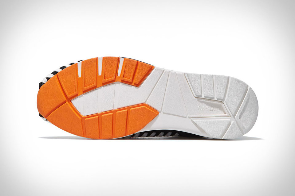 Completely handmade in Italy, the Casbia Hammerhead Lace Up Sneakers are a combination of heritage techniques and fine materials. The upper is crafted from a single piece of black Kudo Antelope leather sourced from UK-based tannery Charles F. Stead & Co. The soft suede-like hide is met with a blue perforated neoprene on the heel and finished with white laces handwoven on the side. The addition of orange details on the outsole, logo patch, along with the vibrant green heel loop, brighten up the colorway on this lightweight runner.