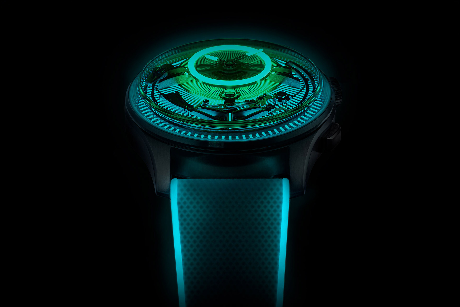 Since its introduction in 2022, Christopher Ward's Bel Canto has deservedly earned a faithful following. The new C1 Bel Canto Lumière gives it a nighttime presence. Within the 41mm grade 5 titanium case lies a base dial plate outfitted with lines of blue Super-LumiNova in a sunray pattern, with a green Globolight ring, Globolight tips on the skeletonized hands, and green Super-LumiNova on the surrounding area to mark the time indication. It's powered by a Sellita SW200-1 movement that's paired with a custom chiming complication that sits above the dial in the six o'clock area, audibly noting the passing of every hour. The C1 Bel Canto Lumière sits on either a three- or five-link bracelet, or on a textured rubber strap with lume running down the sides.