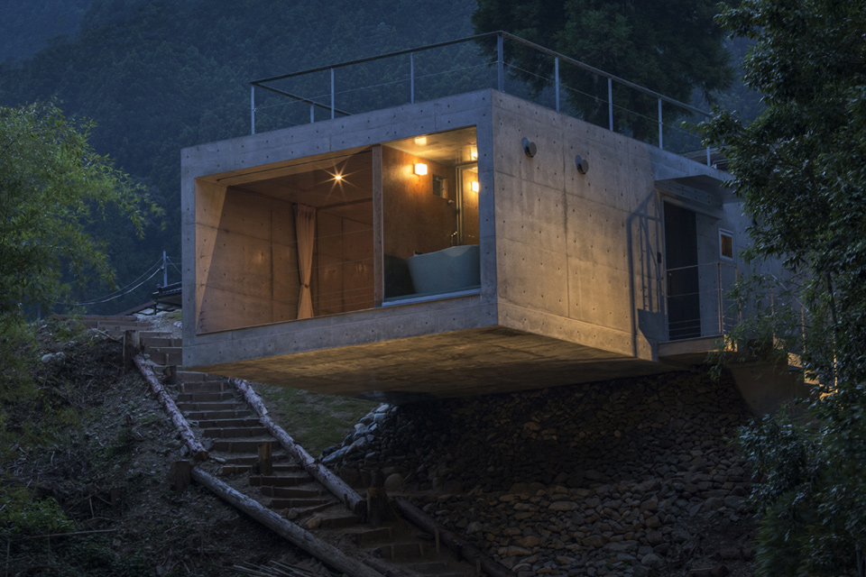 天川村钓鱼小屋拥有一层混凝土外表以及草绿色的屋顶,这让它完美地融入了邻近的河堤环境。这座长方形的建筑坐落于日本圣山大峰山的一角,悬空在山间边缘的一处。这样的安放让它灰色的外观犹如基岩一般存在着。空间与空间之间采用夹板来隔开,内部的直线型空间则拥有一间客房,厨房,空间其中一端是浴室,另一端则是主卧室以及起居室。房屋的尽头装置了滑动门,让内部的空间得以在感官上扩大,并且将屋外的河流与山野之景一并囊括进来,让你一睹自然的风采。