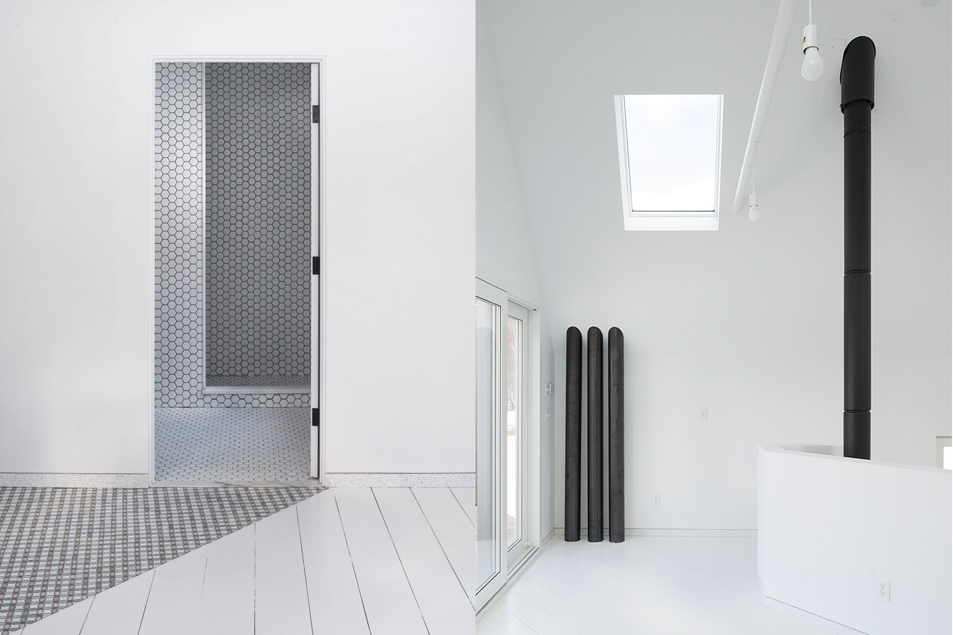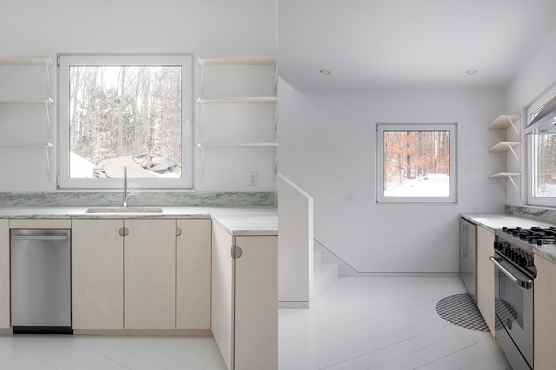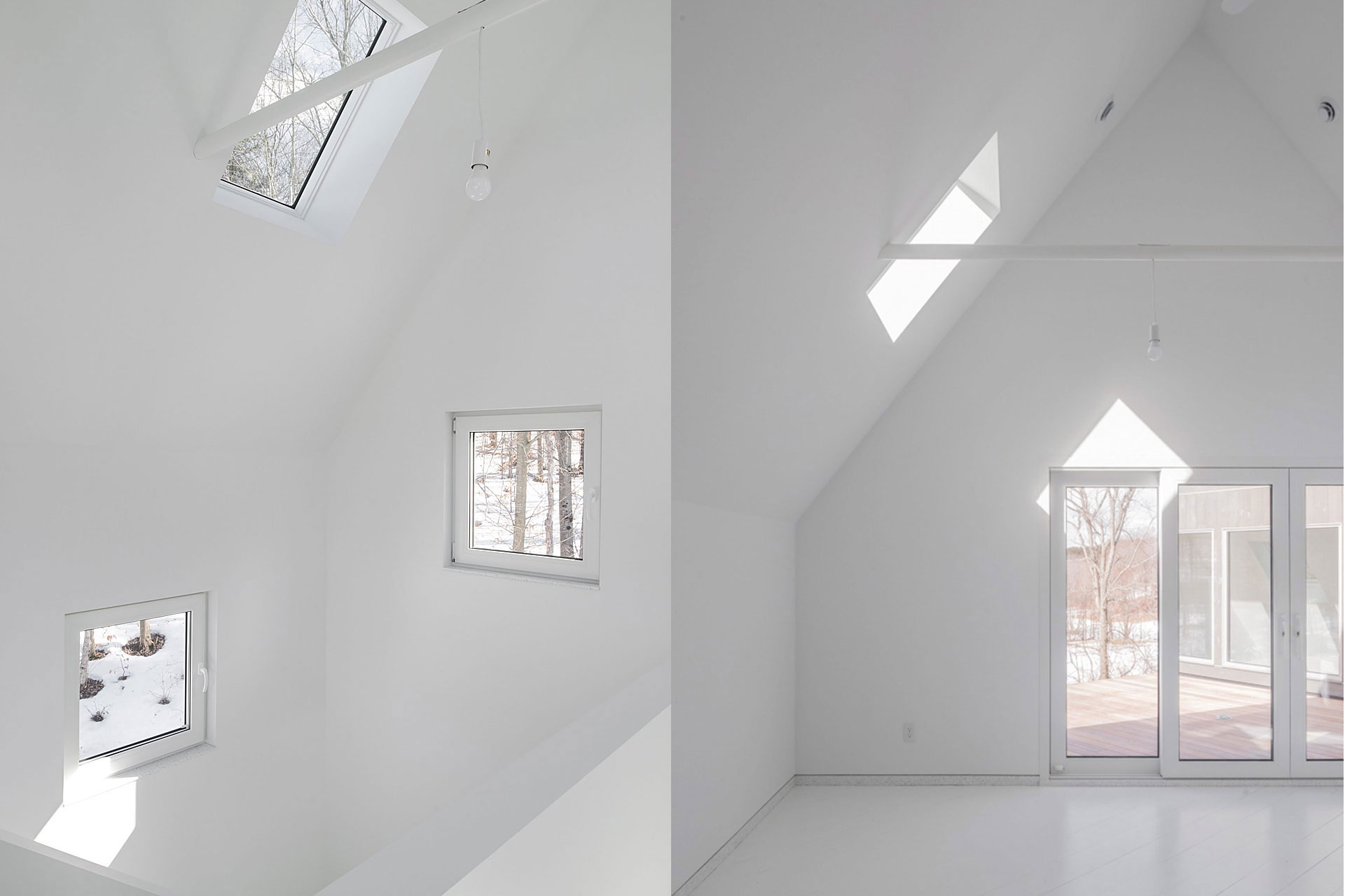 这栋旋桥之家&工作室扎根在佛蒙特州青山山脉的一片65英亩大的区域之中。它的设计风格俨然透露出对这片区域中传统的建筑风格的崇高敬意。这栋房屋分成两个拥有不对称金属屋顶的松木建筑,非常像一个谷仓以及一个披屋。在山型屋顶的下面,就是主房屋,同时旁边那个小房屋一般的建筑就是一个油画工作室。沿着入口通道一直进去,外部的天台将两个建筑连接在一起,并且提供一处供你在室外静坐的地方。与其采用典型的落地玻璃设计,室内采用小心翼翼放在墙上和天花板上的小型窗户来展示自然的景观,从而让周围的风景更似鲜活的肖像画一般。