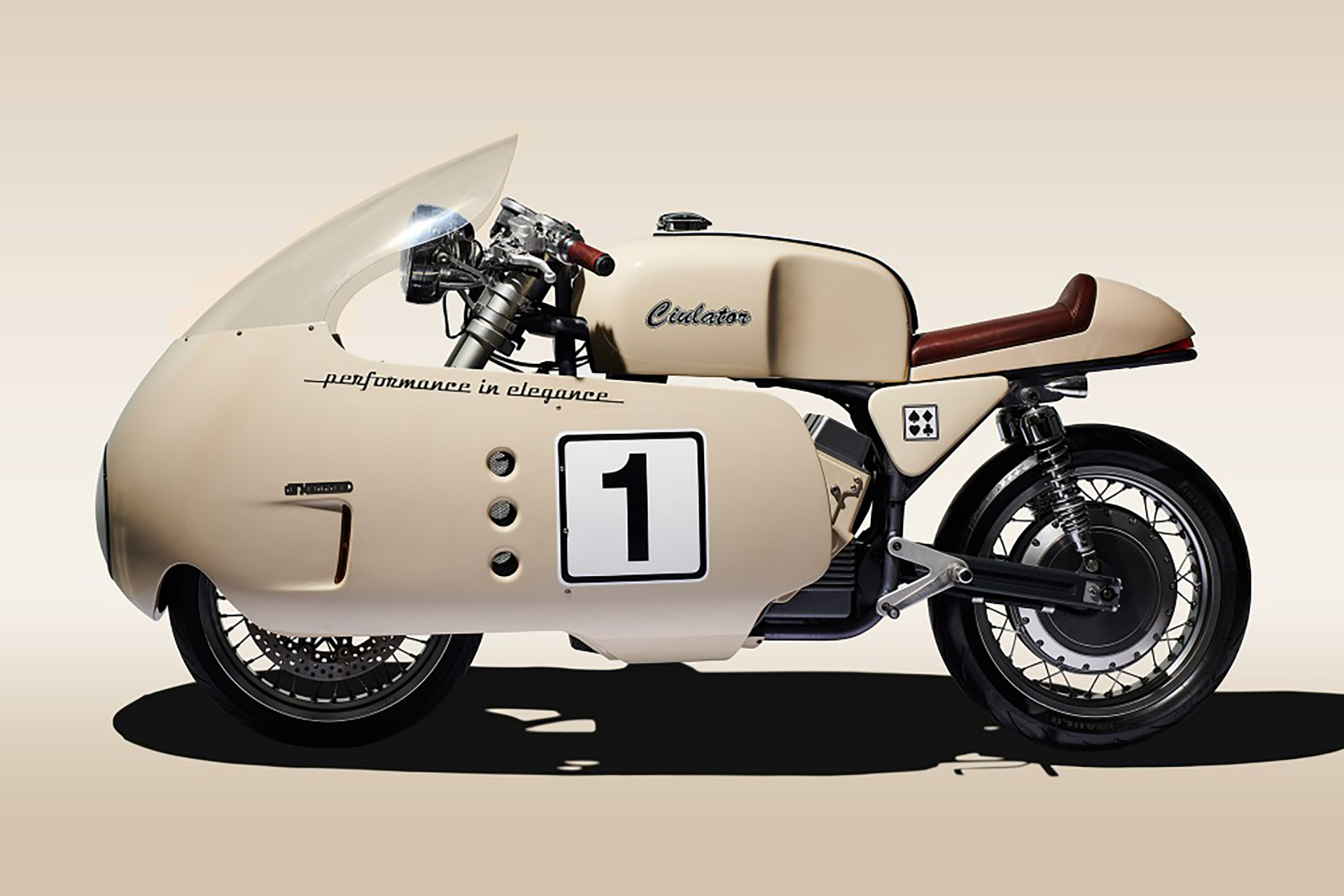 Inspired by classic 1950s British racing motorcycles, the Compass Rose Ciulator is an all-electric cafe racer with a ton of style. At the front, a full nose fairing wraps around the front wheel and forks, with small airflow opening and a windscreen that sits just over the handlebars. The "tank" is similarly elongated, meant to mimic the hand-formed tanks of the time period with indentions for the rider's knees. It's powered by an electric powertrain with a Samsung battery, a BLDC in-wheel hub motor, a top speed of 93 mph, and a range of over 120 miles.