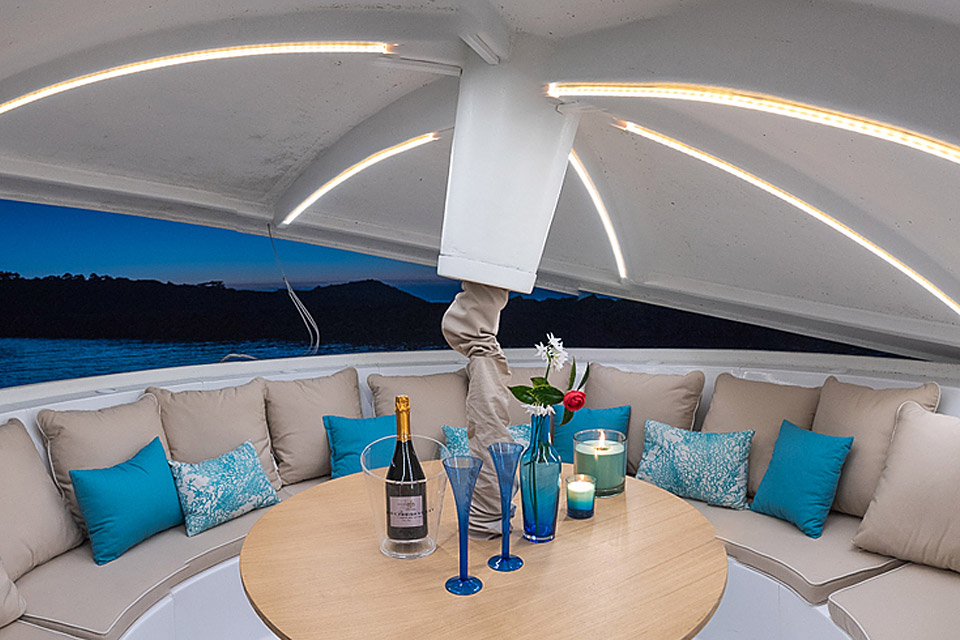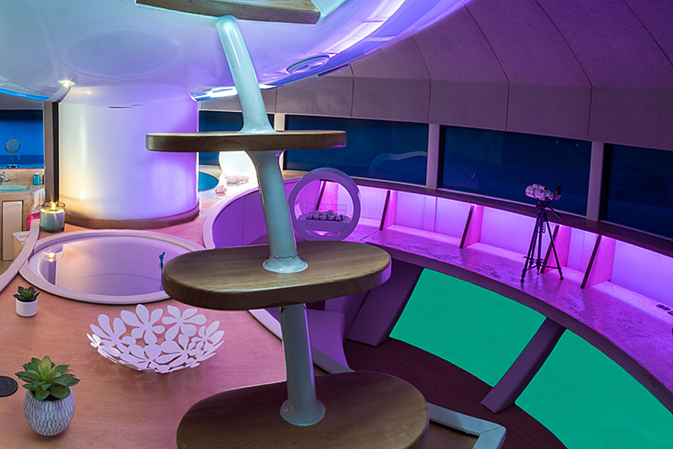 Die Anthenea Floating Hotel Suite wurde von dem 1977 erschienenen Bond-Film The Spy Who Loved Me inspiriert und ist ein luxuriöser Ort im Wasser. Die seefahrende Untertasse ist das Werk des Marinearchitekten Jean-Michel Duacancelle, und obwohl sein Einflussnehmer Karl Stromberg Pläne hatte, die Welt zu zerstören, versucht Anthenea, sie zu schützen. Die umweltfreundliche Kapsel ist vollständig autark und verwendet fünf Solarmodule für die Stromversorgung und verantwortungsvolle Abwassersysteme. Das nachhaltig gestaltete Interieur ist eine Tanne für einen Bösewicht aus dem 21. Jahrhundert mit einer Wet-Bar, einer Lounge, einem Wohnzimmer und einem Hauptschlafzimmer mit einer runden Badewanne. Während die Wohnräume mit großflächigen Verglasungen verkleidet sind, bietet ein oberes Solarium mit 12 Sitzplätzen einen 360-Grad-Blick auf die ozeanische Landschaft.