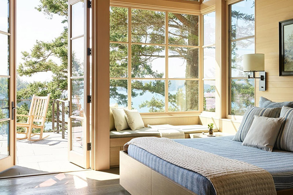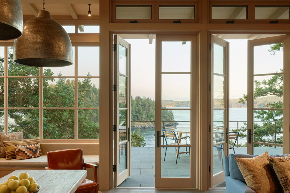 Das Hillside Sanctuary mit Blick auf den Puget Sound bringt Appalachen in den pazifischen Nordwesten. Das Steingebäude und das Gästehaus sind von einem alten Berghaus inspiriert, das bei einem Brand verloren ging. Sein Inneres wird von zwei massiven Kaminen definiert, die aus dem gleichen Material wie die Felsfassade bestehen. Die Hauptwohnräume werden durch helle Holzwerkstoffe und viel natürliches Licht aufgehellt, was der rustikalen Palette einen modernen Kontrast verleiht. Hinter der weitläufigen Verglasung befindet sich eine Außenterrasse. Der Wohnraum im Freien befindet sich am Hang und bietet einen weiten Blick über die abgelegene Landschaft.
