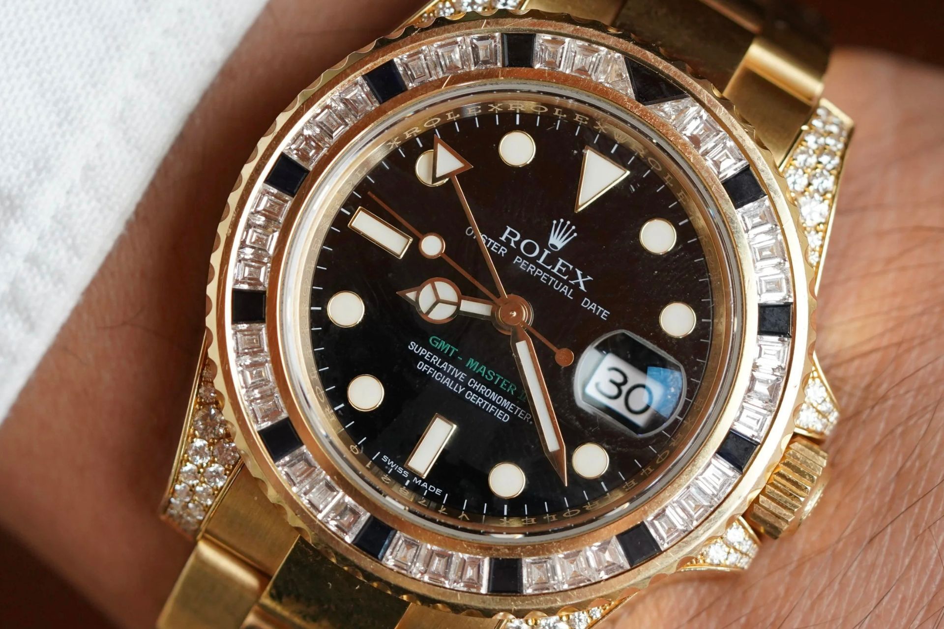In 2011, Drake wore this Rolex GMT-Master II on the cover of Take Care, an album that went Diamond, spent 400 weeks on the Billboard 200, ranked 95th on Rolling Stone's 500 Greatest Albums of All Time, and won Best Rap Album at the 55th Grammy Awards. The same watch appears on his wrist in the "Marvin's Room" video. The watch is reference 116758SANR, built in 18K yellow gold with a 40mm case and a bezel inlaid with 36 baguette diamonds and 12 black sapphires, one cut into a triangle, which double as hour markers and a third time zone function. The lugs and crown guards are diamond-set, and the caseback is engraved with Drake's OVO Owl, the symbol of his October's Very Own label. Rolex produces gem-set references like this through an internal artisanal department using flawless stones hand-set by master jewelers, making them among the most labor-intensive watches the manufacturer builds. This example is unpolished, comes full set with box, papers, and OVO memorabilia including the owl statue from the album cover, clothing, and backstage passes. It came from an original owner who worked alongside Drake in his early Toronto years.