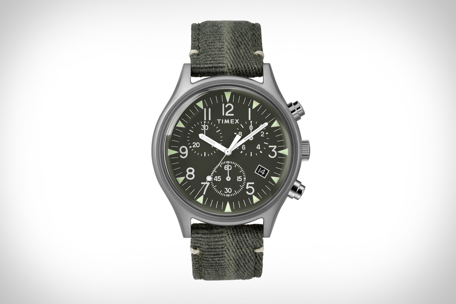 Re-inspirado para el uso diario, el Cronógrafo Timex MK1 es otro reloj inspirado en especificaciones militares del relojero histórico. El reloj cuenta con una caja de 42 mm hecha de acero inoxidable de calidad aeronáutica que se completa con un acabado mate, mientras que la esfera verde cuenta con una mezcla fácil de leer de marcadores luminosos Arabic e INDIGLO, ventana de fecha y función de cronógrafo que mide hasta 1/20 segundos. El MK1 funciona con maquinaría QA y está terminado con una correa de tela verde. El Cronógrafo MK1 también está disponible con una caja y correa negra, una esfera blanca con correa gris o una caja de acero inoxidable con una esfera y correa de color marrón