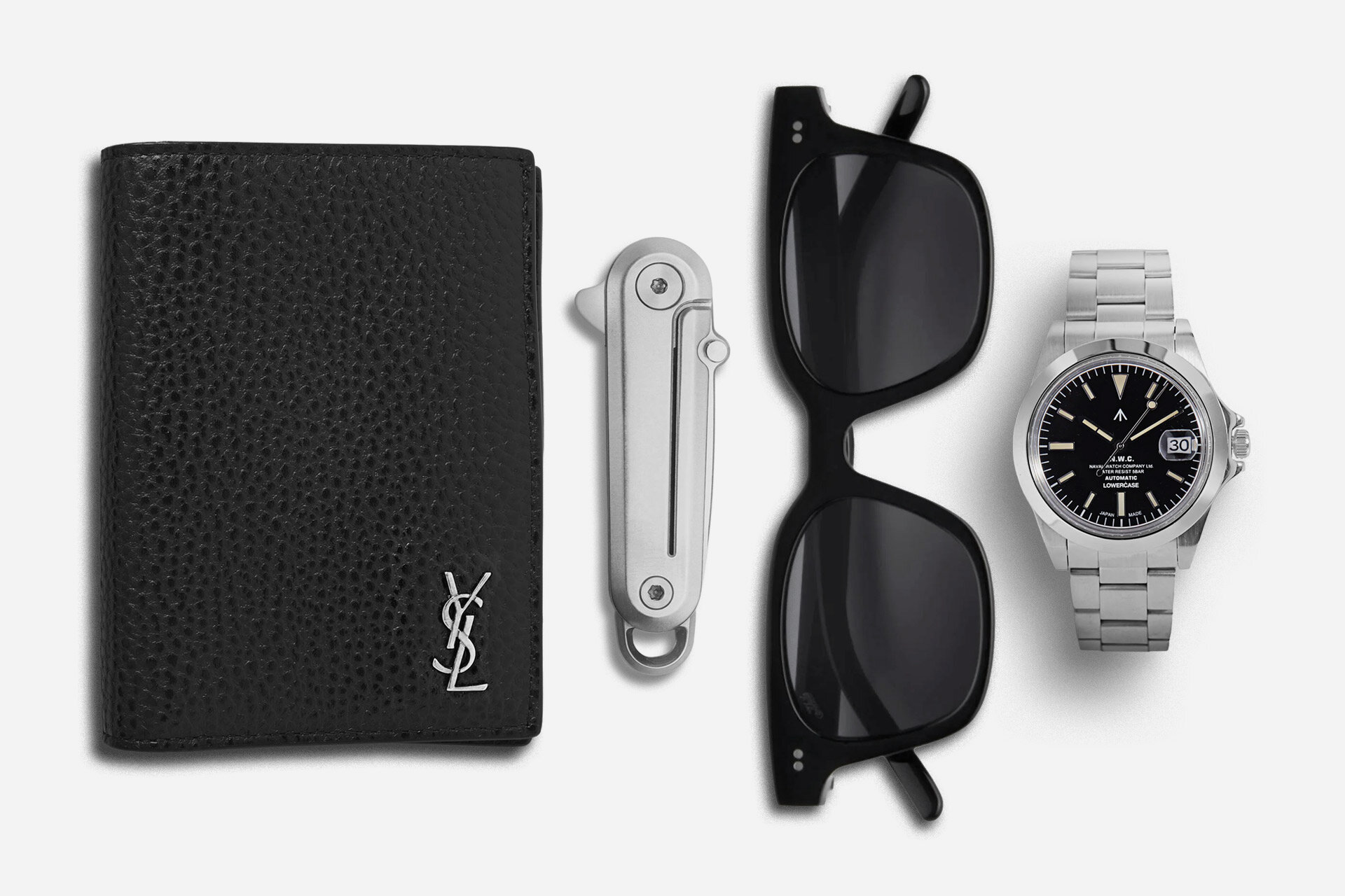A stainless Naval watch leads this sleek set of Lark knife, Hi-Fi sunglasses, and YSL wallet.