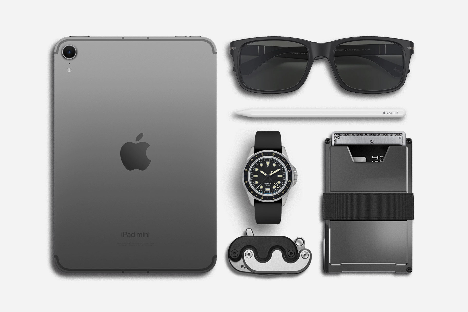 Sometimes grey is better than black, as evidenced by this mix of iPad, sunglasses, watch, and wallet.