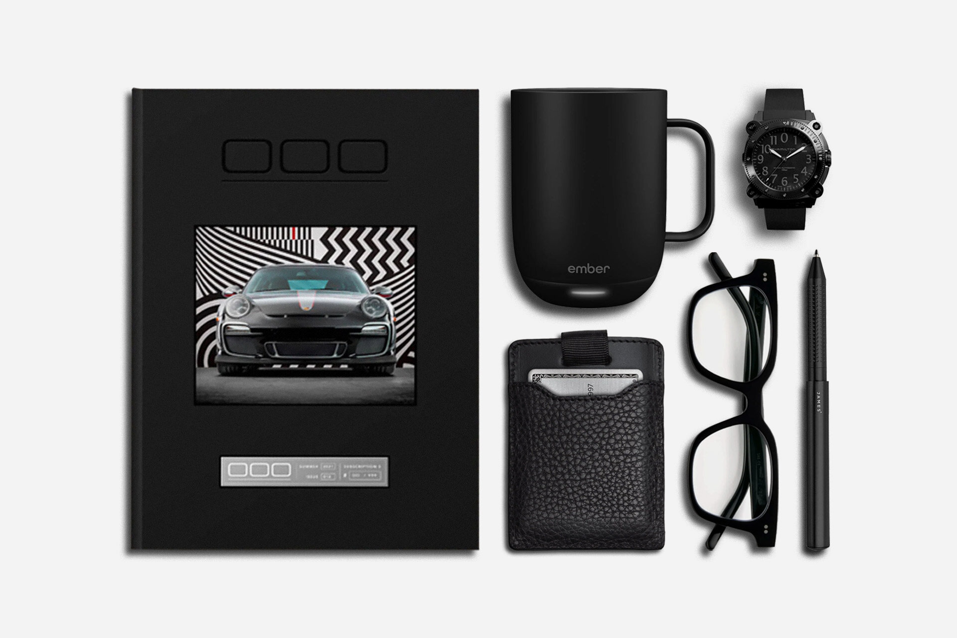 A Porsche-focused magazine leads off this well-heeled set of mug, wallet, watch, glasses, and pen.