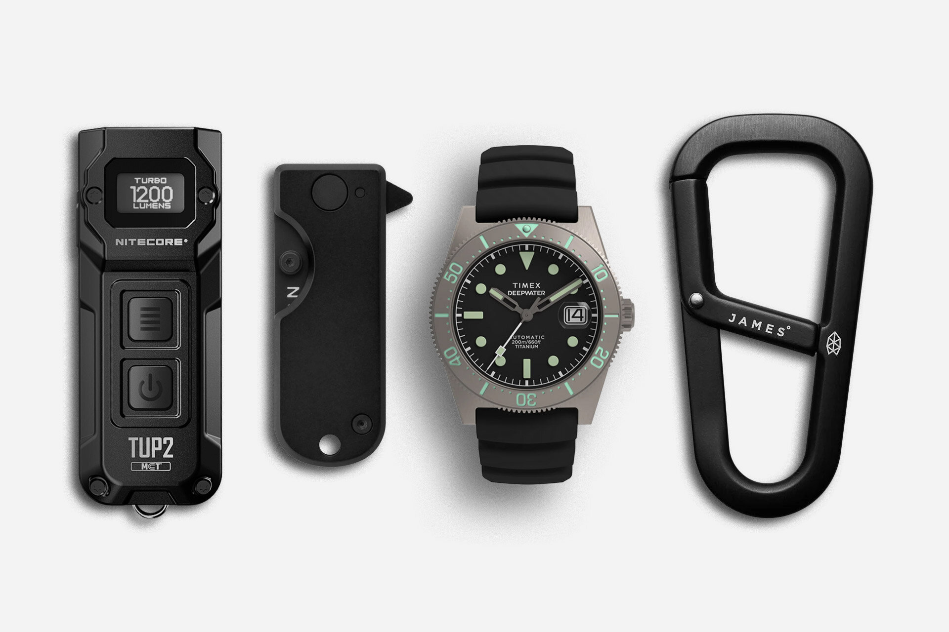 Tackle tasks under the cover of dark with this black set of flashlight, knife, watch, and carabiner.