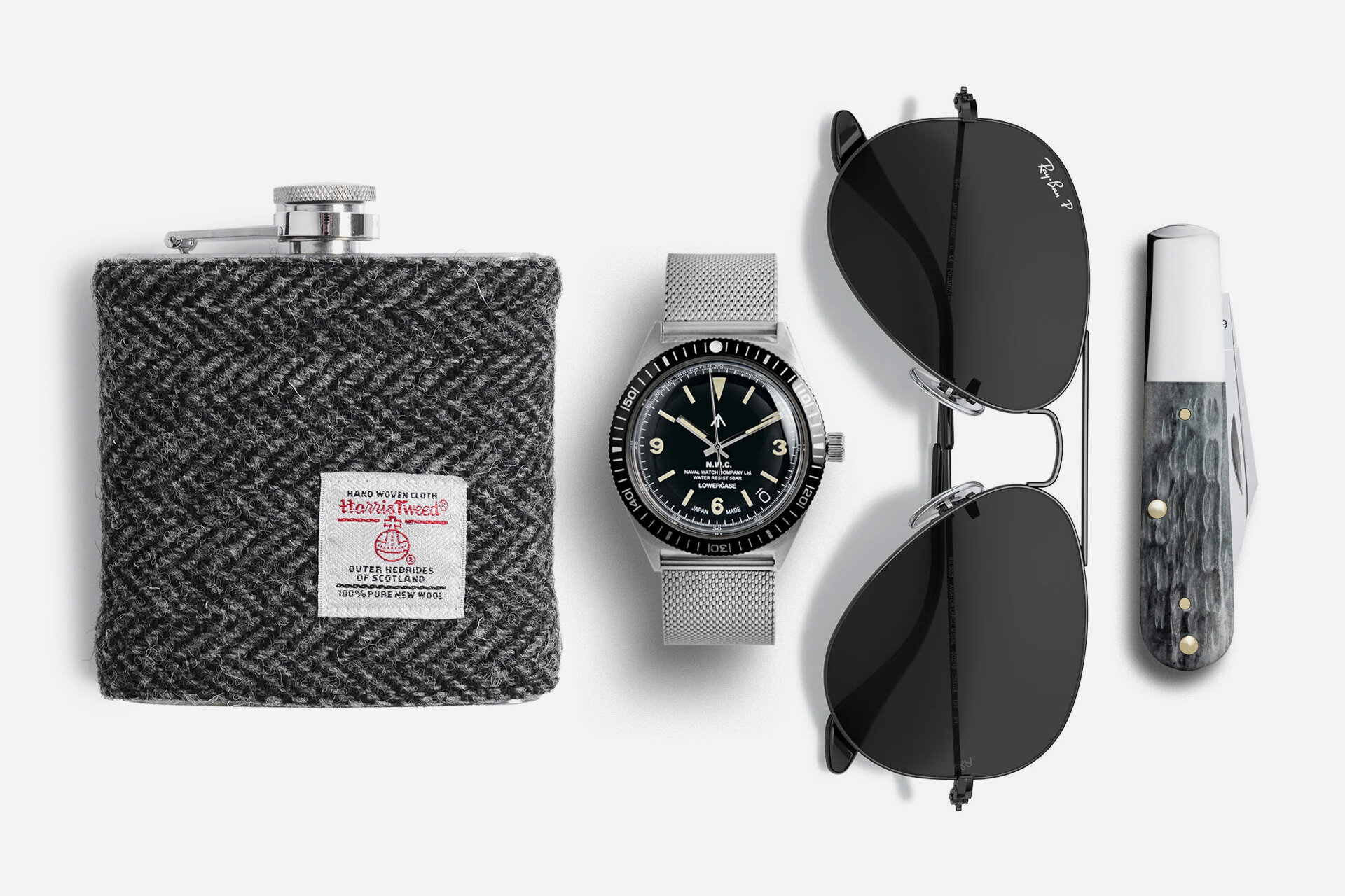 A Harris Tweed flask is the flagship of this silver and black set of watch, sunglasses, and knife.