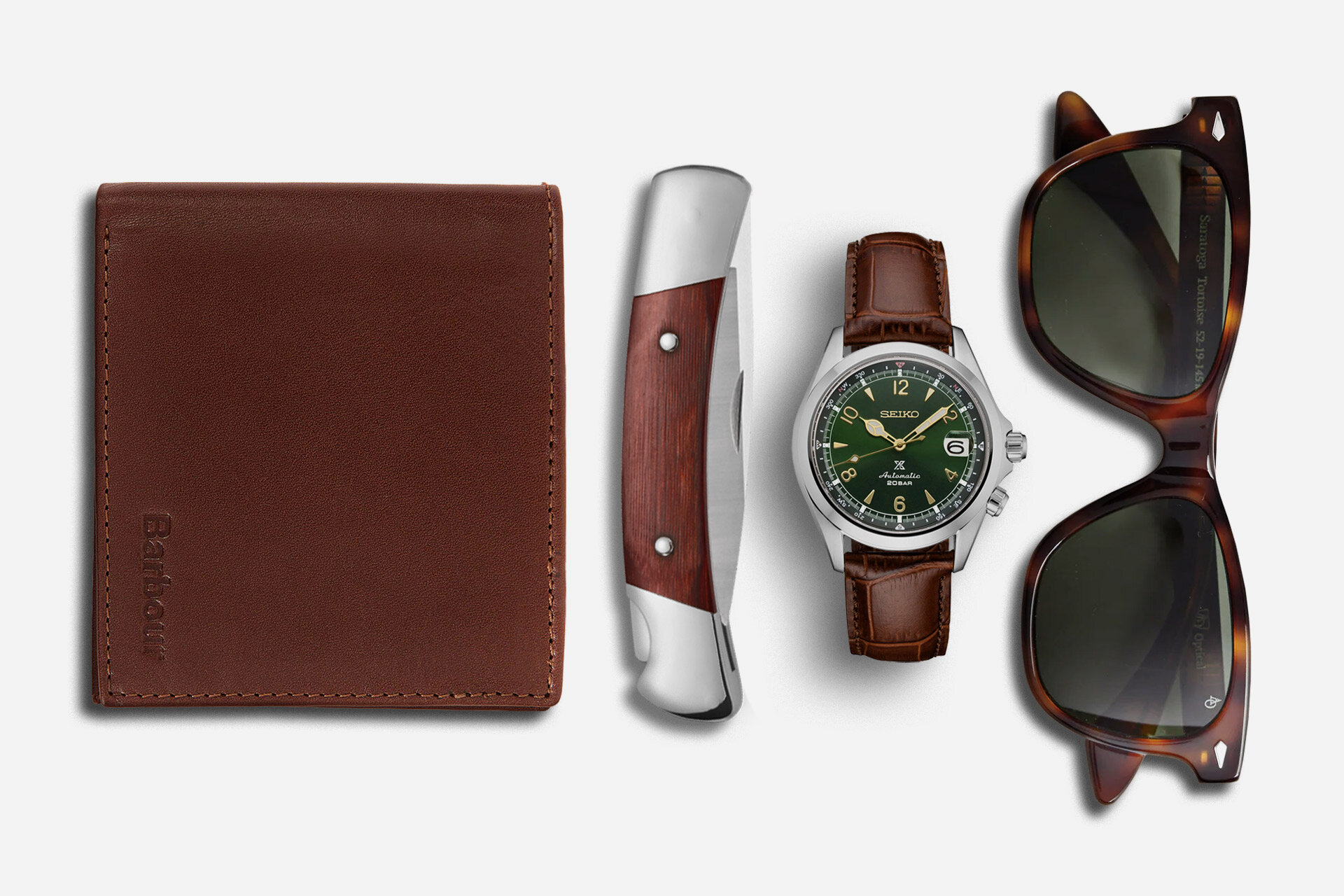 A recreation of JFK's favorite sunglasses leads this loadout of wallet, knife, and field watch.