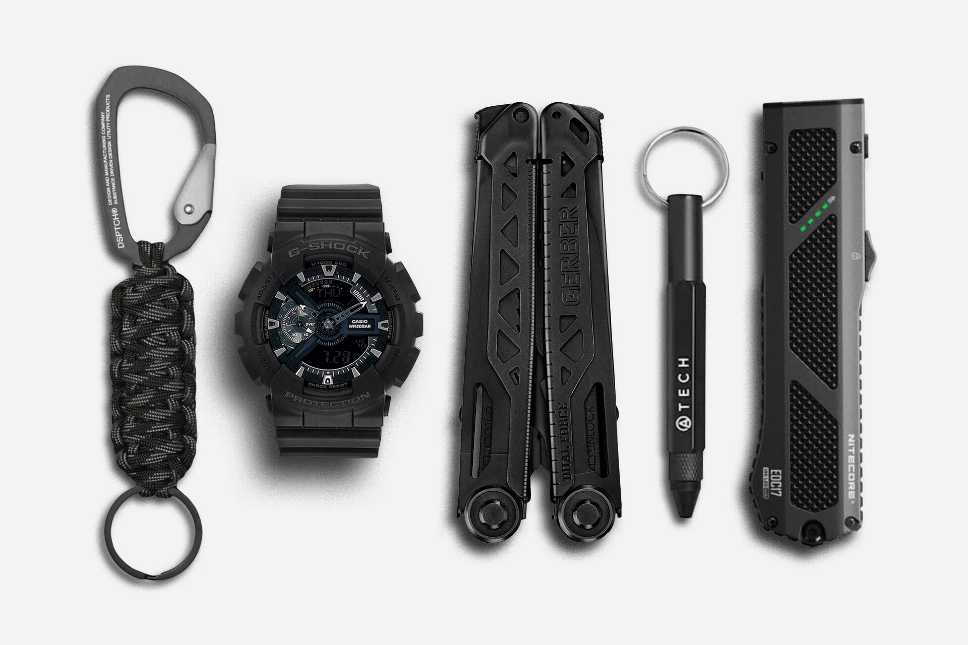 Fashion yourself an ad-hoc Bond with this all black set of keyring, watch, tool, pen, and knife.