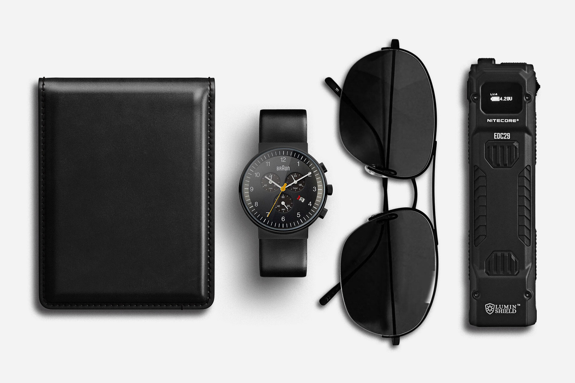 An all-black aesthetic lends a direct look to this set of wallet, watch, sunglasses, and flashlight.