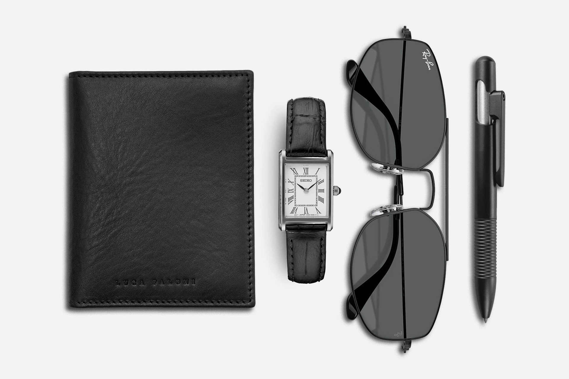 This sleek EDC pairs a cardholder, classic dress watch, shades, and a rugged pen for everyday utility.