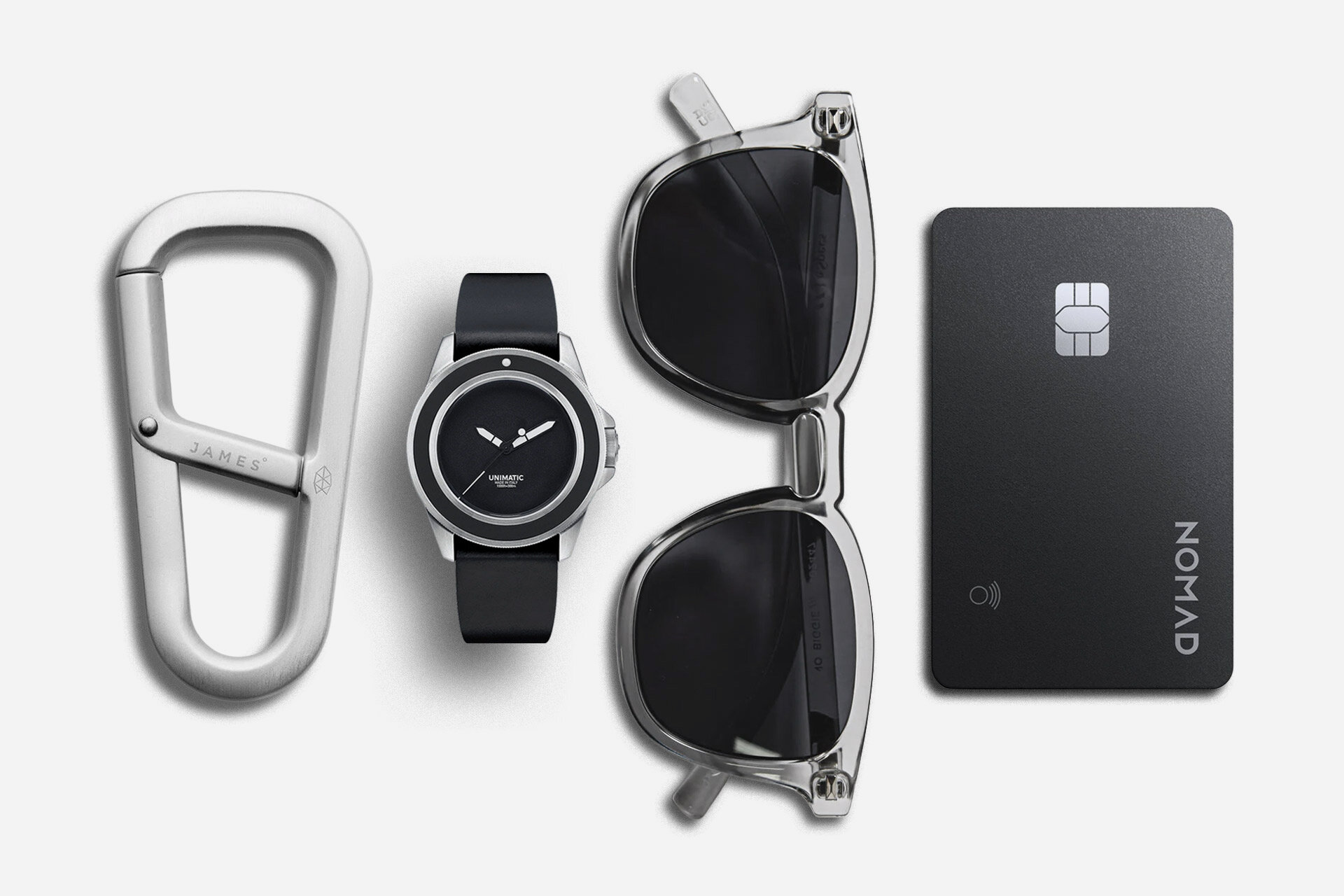 A Unimatic watch anchors this sleek carry of James Brand clip, Le Specs shades, and Nomad.