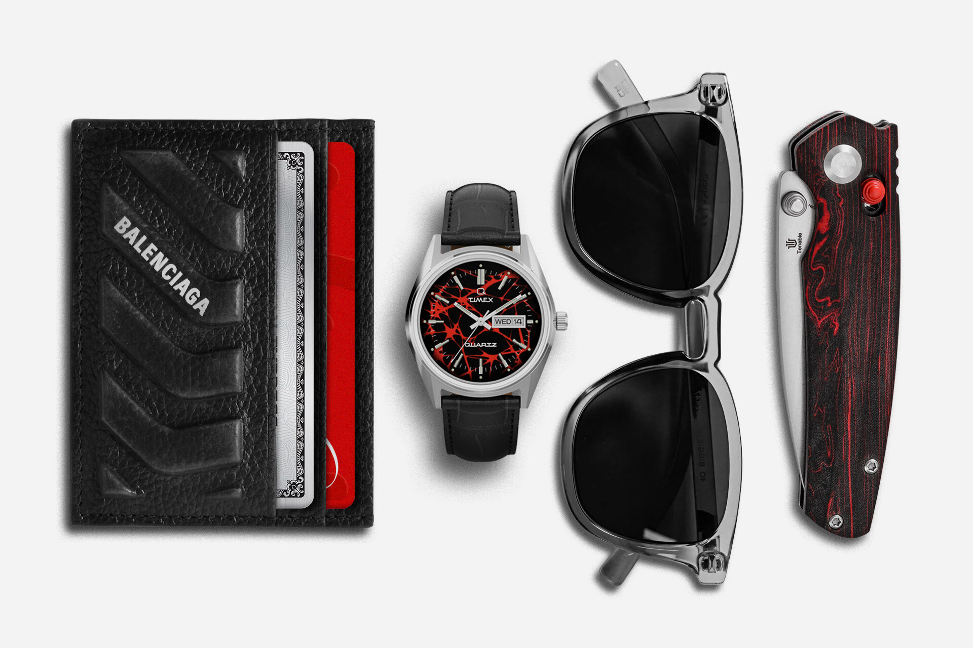 These black and red essentials pair Timex Vega with Balenciaga wallet, Le Specs, and Tenable knife.