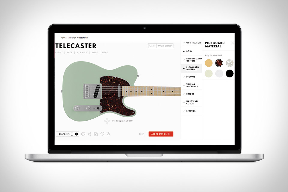 Whether you play professionally or just jam out in your garage, there's nothing like having a customized guitar. Fender Mod Shop Guitars give you chance to do exactly that. Using a slick web-based interface, this new service lets you order a Telecaster, Stratocaster, Precision Bass, or Jazz Bass that's perfectly matched to your style and sound. No matter which model you choose, you get to pick your own fingerboard, tuning machine, bridge and hardware color, body color and pickguard combo, and pickup. Once you're done, your custom axe will be built by the skilled technicians at Fenders Corona, CA factory and shipped to you within 30 days, so you won't have to wait long to start playing.