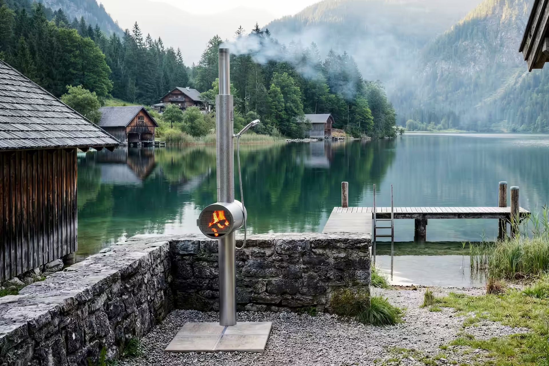 Feuerwasser's garden shower heats water in three minutes using nothing but wood. The Austrian-made stainless steel frame houses a patented wood-fired heater at its center that warms water as it flows through, eliminating reliance on electricity, solar panels, or gas lines. Light small logs in the combustion chamber and adjust temperature via mixing valve from cold to scalding. The over eight-foot tall unit sits on a steel stand designed to hold four standard stone slabs for stability without ground anchoring, making it fully portable across backyards, mountain cabins, or lakeside properties. No screens, pumps, or buttons. Just fire, water, and a temperature knob.
