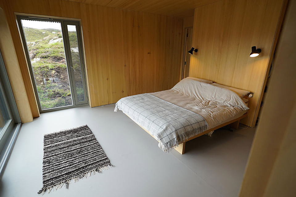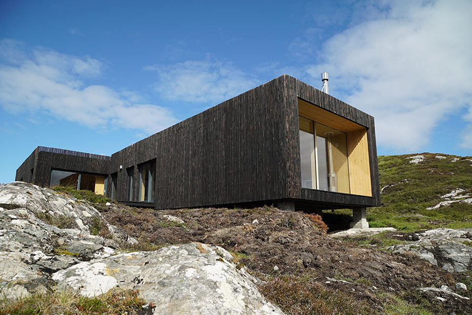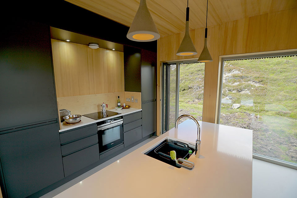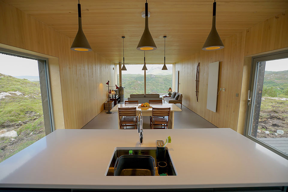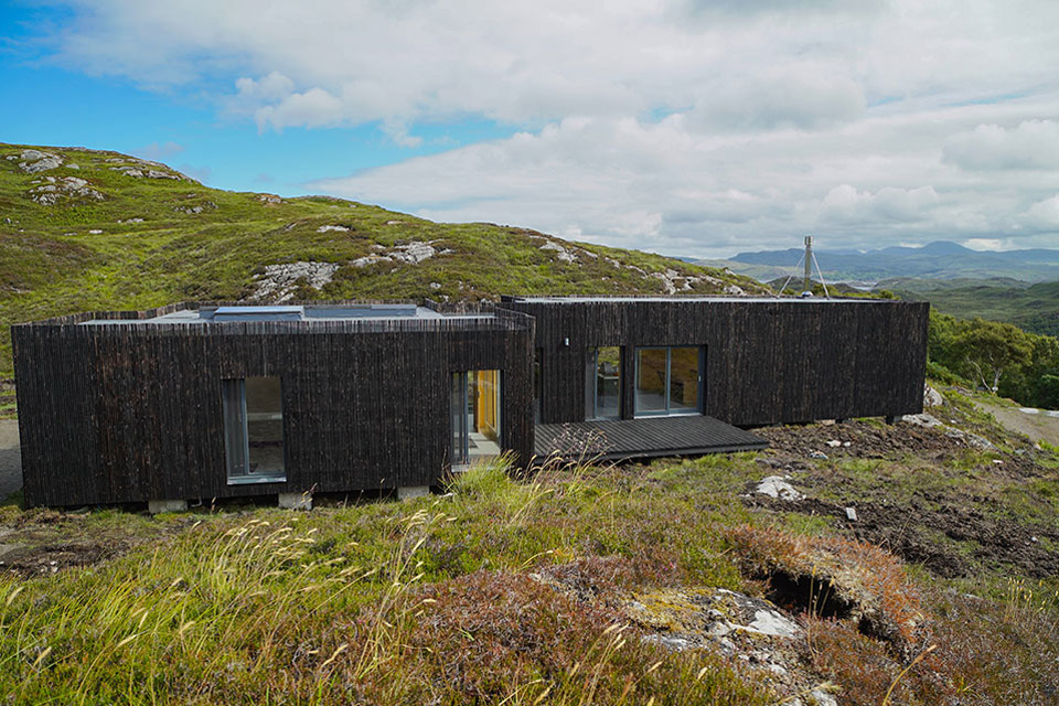 Nichée entre deux affleurements rocheux dans les Highlands écossais, la maison Nedd est délicatement placée sur le terrain pour éviter de perturber le paysage vierge. Pour ce faire, la maison est composée d'une série de modules en bois lamellé croisé reposant sur des plinthes en béton. Chacune des gousses est recouverte de mélèze carbonisé à l'extérieur. Doublé de bois chaleureux à l'intérieur, chaque volume est divisé par fonction et relié par un seul couloir vitré. Alors que des fenêtres judicieusement placées encadrent des vues sur les collines verdoyantes, deux murs de vitrage orientés à l'est offrent une vue imprenable sur le Loch Nedd et Quinag au loin.