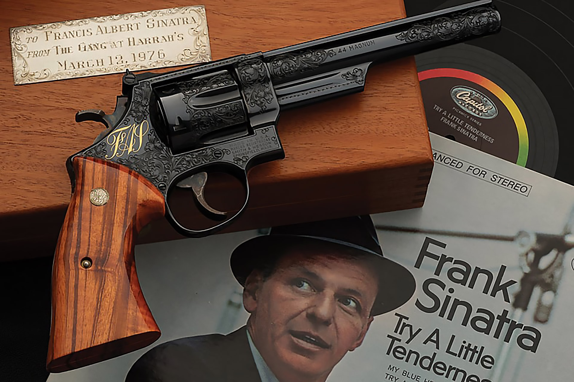 Ol' Blue Eyes. The Chairman of the Board. Regardless of what you call him, Frank Sinatra left an indelible mark on culture. This Smith & Wesson is an homage to the legendary crooner. Presented to Frank in 1976 by the "gang from Harrah's," it's the same .44 magnum model that was made famous to Clint Eastwood in Dirty Harry, with a 6.5" barrel, intricate scrollwork from Alvin A. White, and an inlaid gold piece with Frank's initials. The gun will be up for auction from Rock Island Auctions.