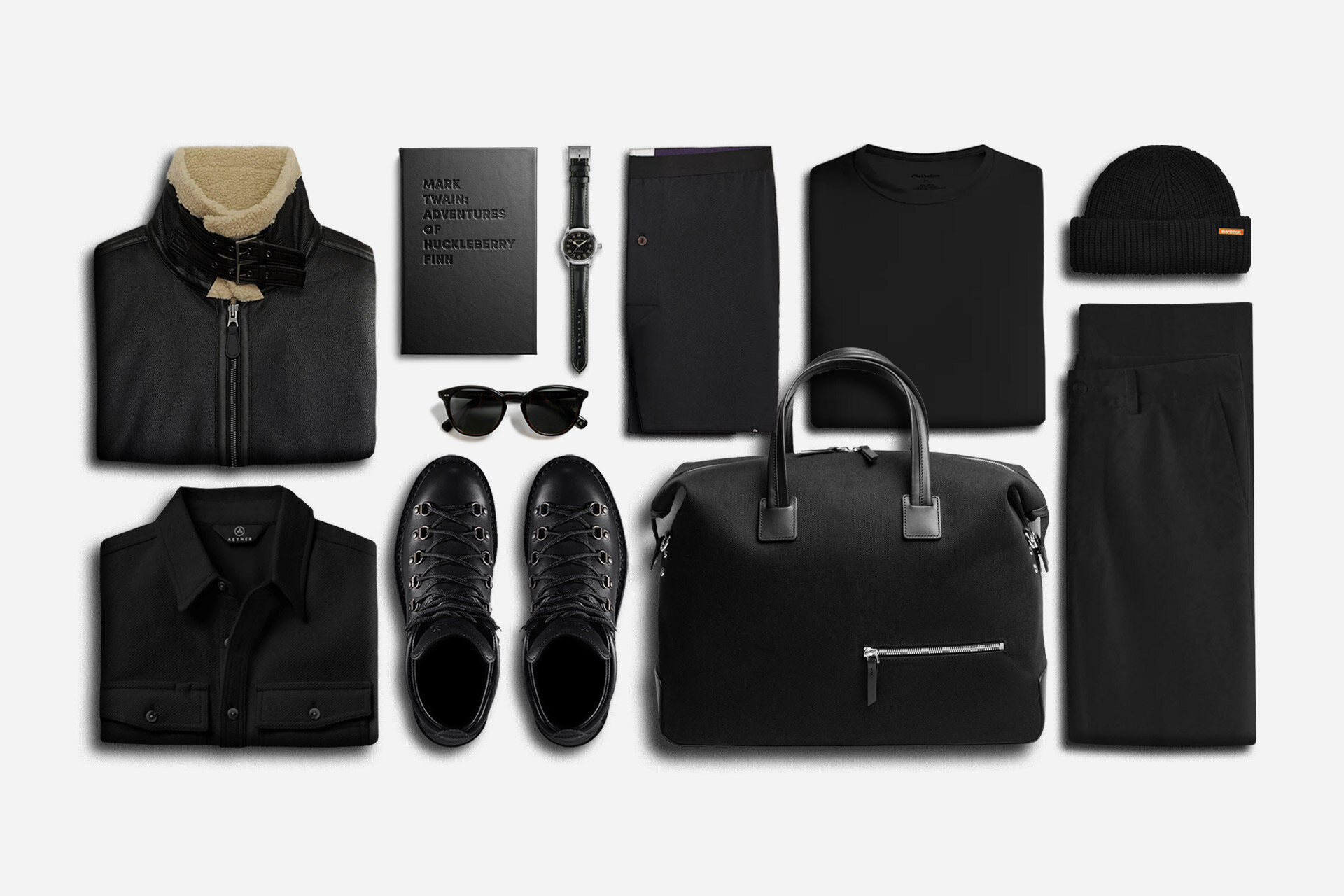 A black weekender capable of holding all the other clothing and accessories in this all-black outfit.