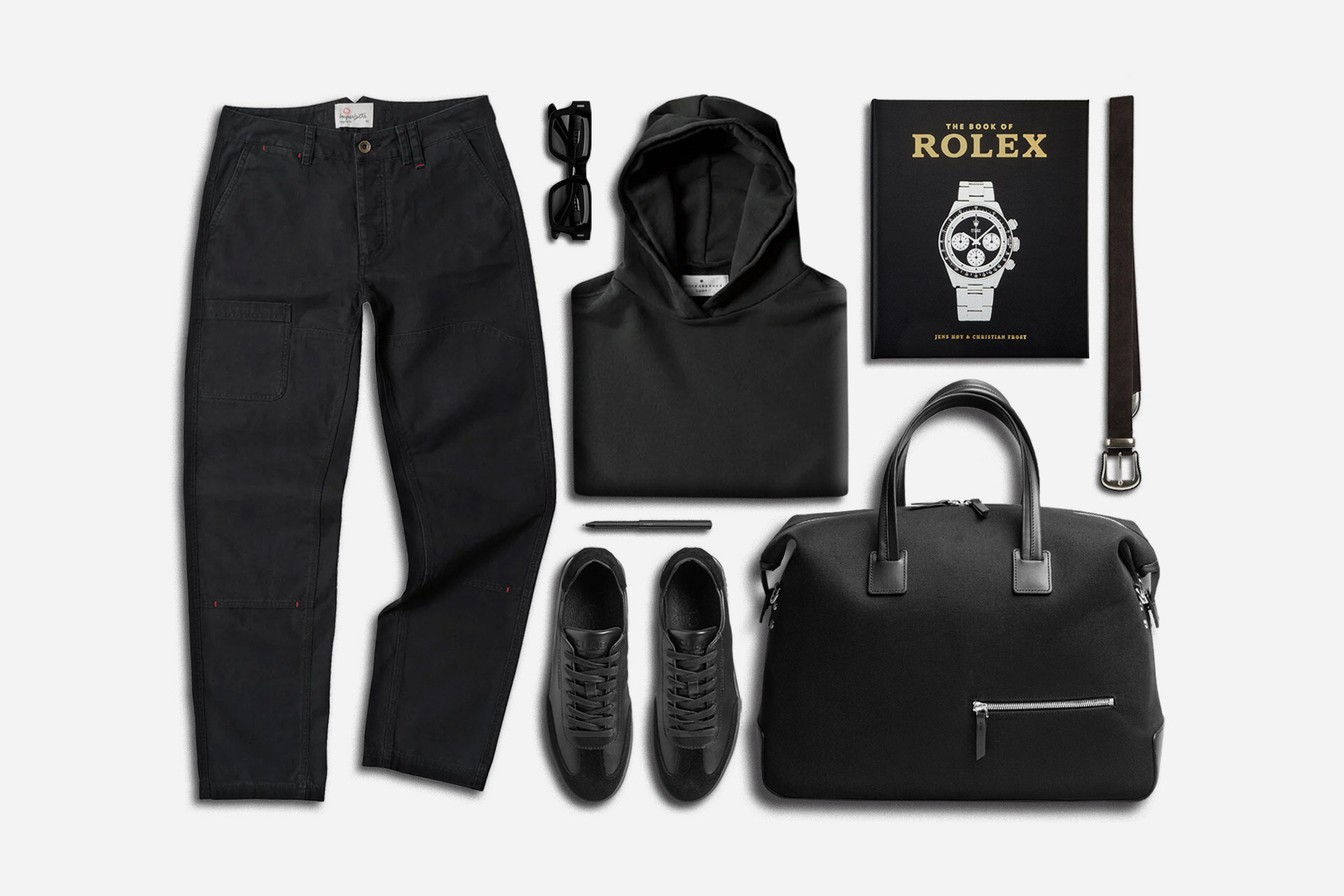 Blacked-out layers pair Imogene + Willie hoodie with Lundi bag, Clae kicks, and Imperfects pants.