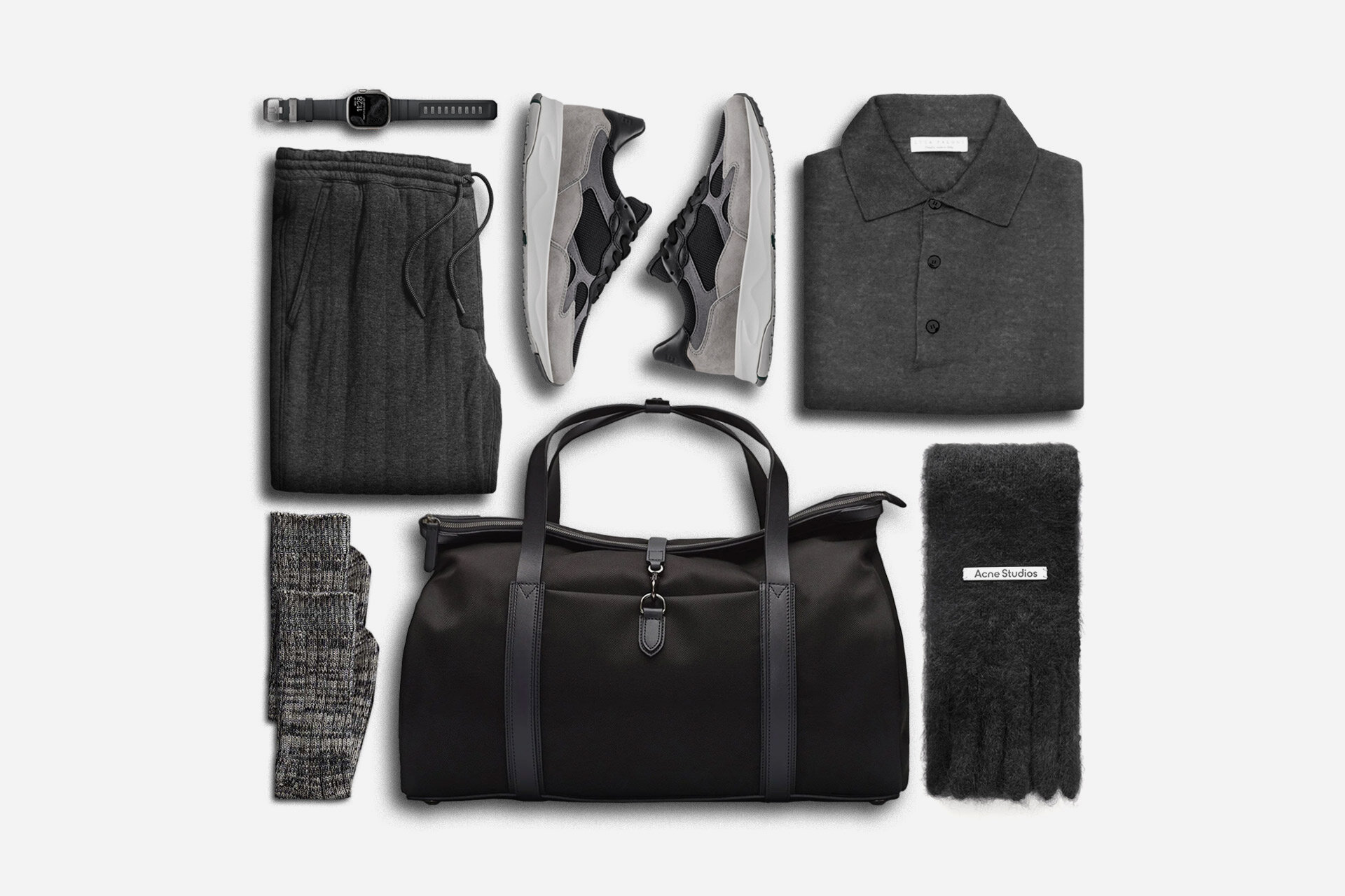 Prepare properly for gloomy weather this travel-ready grey and black ensemble.