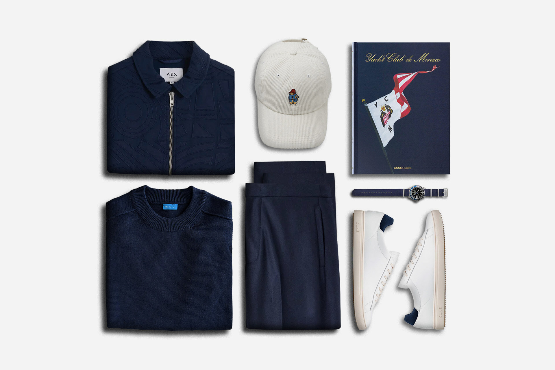 Monaco yacht-club style pairs Wax London navy with Loro Piana and Paddington Bear cap.