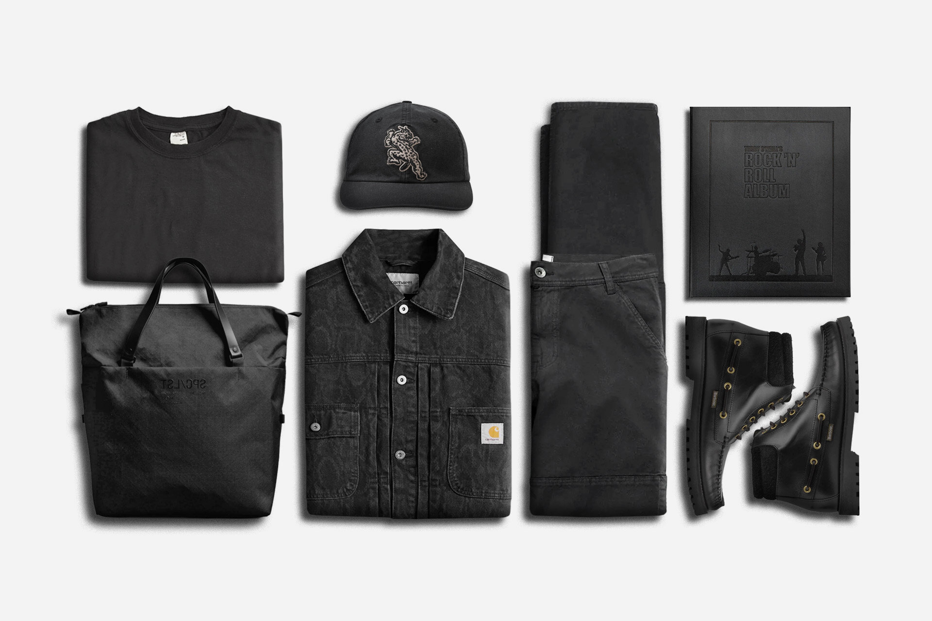All-black layers pair Carhartt jacket with Imogene + Willie tee, Topo pants, and Barbour boots