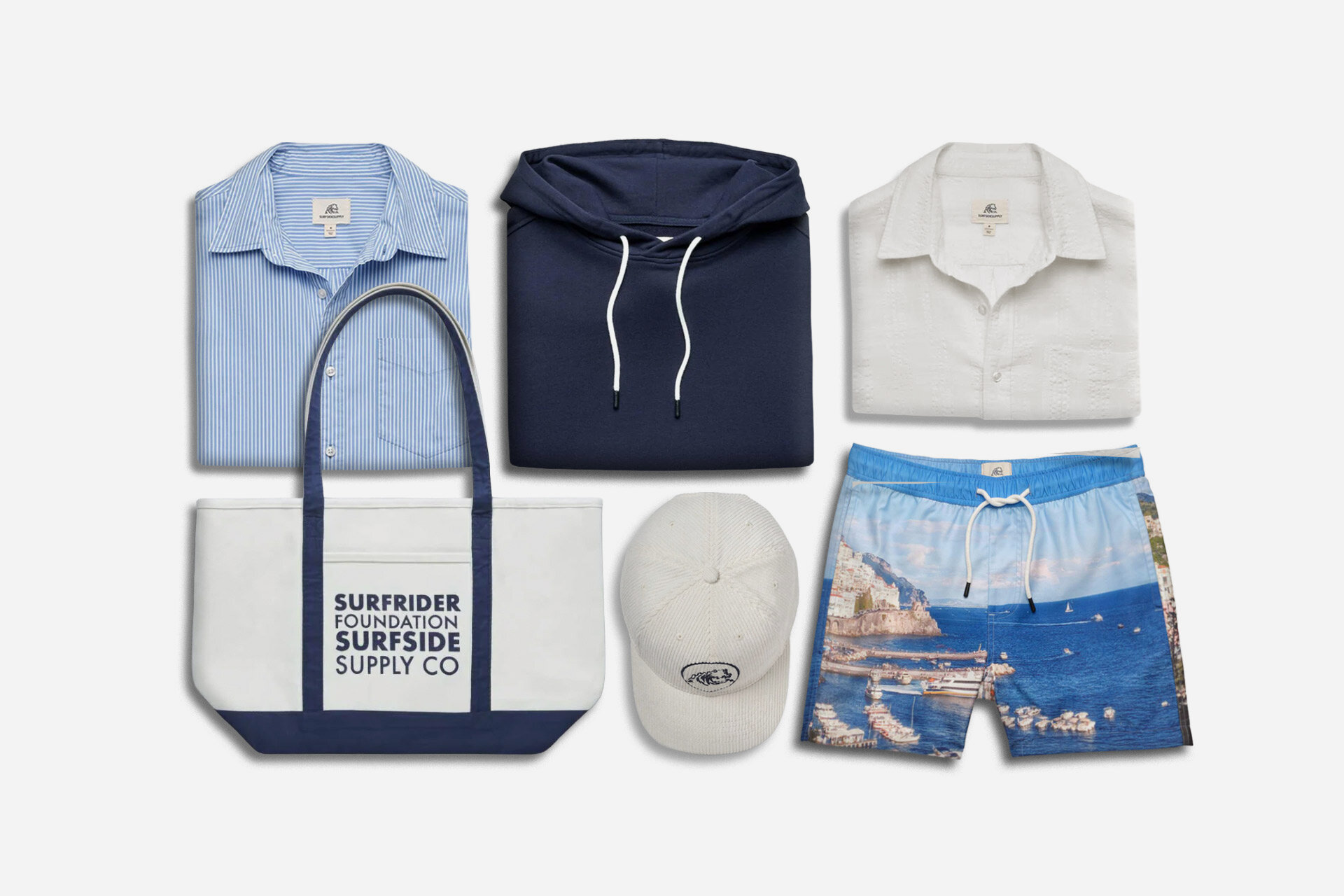 All-Surfside coastal look pairs pinstripe shirt with Amalfi trunks and canvas beach bag.