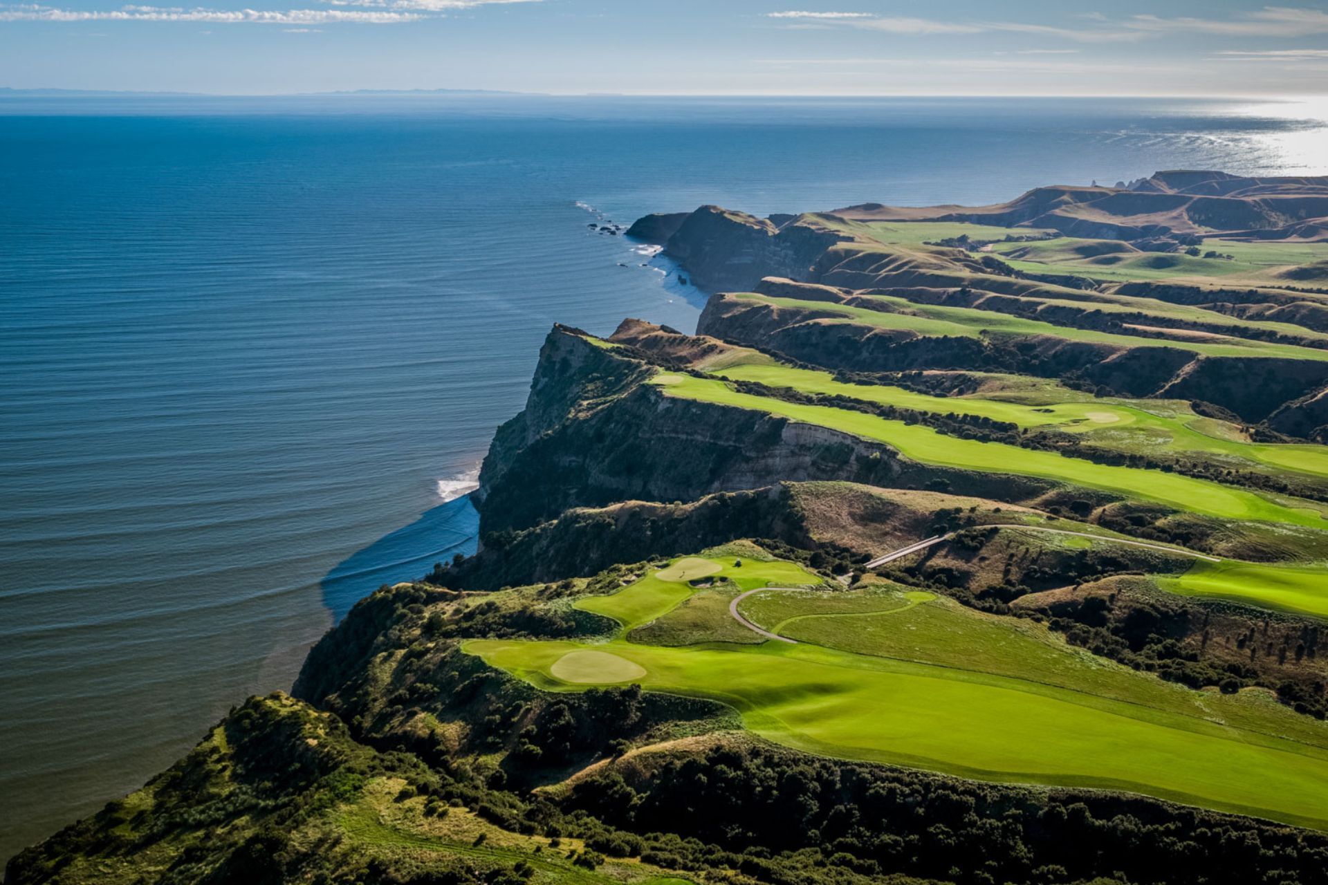 Tom Doak's clifftop masterpiece runs along finger-like ridges 500 feet above the South Pacific on a 6,000-acre working sheep and cattle station in Hawke's Bay, New Zealand. Ranked among Golf Digest's Top 20 courses in the world, the par-71, 7,147-yard layout opens with a rugged front nine cutting through deep ravines before the back nine follows the clifftops to the ocean's edge. The culminating 650-yard, par-5 15th narrows to 40 yards of fairway where the left edge drops more than 400 feet to the water. Getting there is part of the experience: after the gates, you drive 15 minutes through cattle pastures before the clubhouse comes into view.