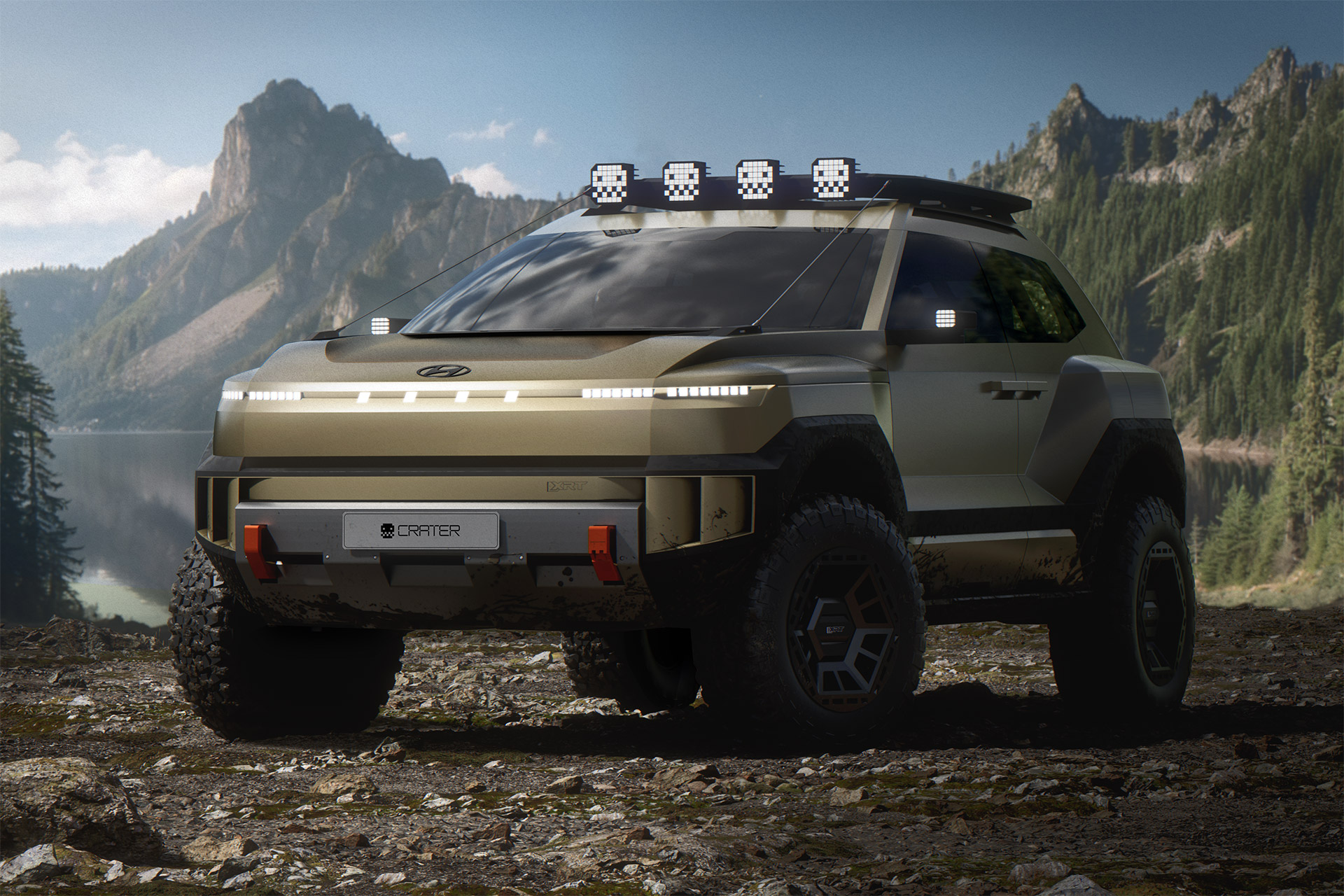 Conceived by the team at the Hyundai America Technical Center in Irvine, CA, the Crater concept is a compact, futuristic electric SUV made for off-road adventure. On the exterior, the angular, sculptural bodywork is clad in green-gold matte paint and is joined by prominent skid plates, a roof platform for adding auxiliary lighting, extra storage, or other accessories, short overhangs for steep approach and departure angles, and hexagonal faceted 18-inch wheels clad in 33-inch off-road tires. Built on a monocoque architecture, the interior has exposed roll cage bars, bolstered seating, four-point harnesses, and a full-width head-up display, augmented by a bring-your-own-device infotainment solution. The Hyundai Crater Concept will be viewable at the Los Angeles Auto Show through Sunday, November 30th.