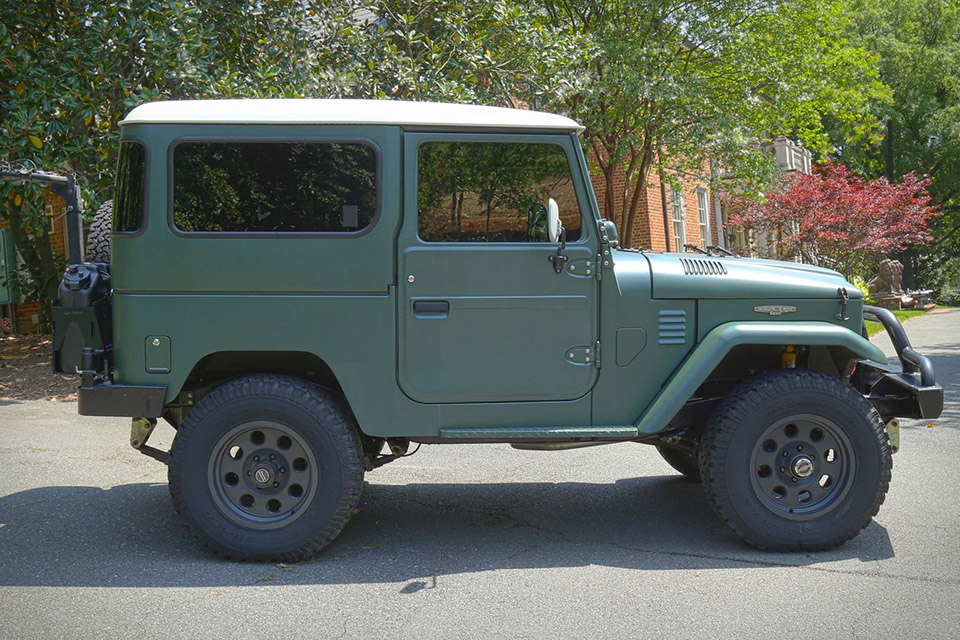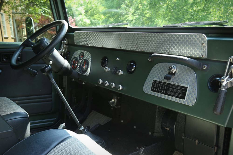 Built by Jonathan and Jamie Ward, this 2008 Icon 1970 Land Cruiser FJ40 is a tribute to the original Toyota Land Cruiser. It's built atop a J40 Land Cruiser, with a 350 hp 5.7L GM RamJet V8 engine under the hood, hand-built H52 aluminum body painted in a hybrid blend of Teflon and Spruce Green Cardinal paint powder. The seats are done in OF German marine vinyl with Chilewich textile panels, while the interior floors are coated in polyuria, and the dash mixes old-school gauges alongside panel knobs for functions like the wipers and lights. It's finished with a removable hardtop roof and side panels, Teflon-coated ATX Mojave wheels, and accessories like a two hitch, spare tire, and Jerry can.