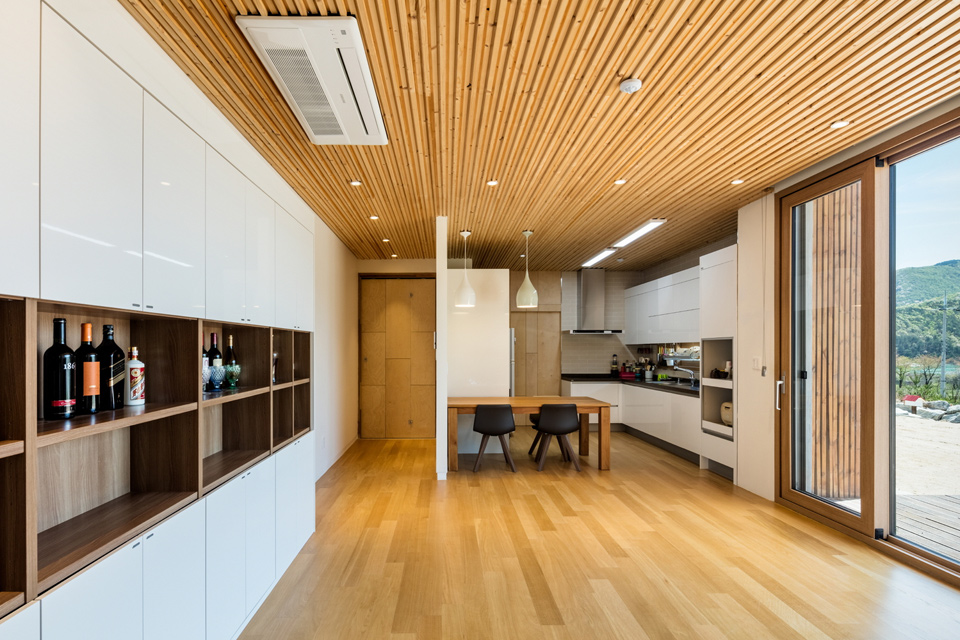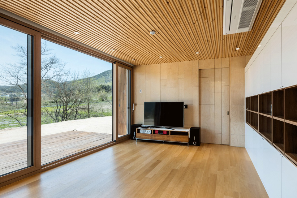 松やコンクリートとの合体されたなかで、アップルファームハウスは、その山岳風景に溶け込んでいる。南に面した高地にあり、隣接するジュックジャンミョン山脈の広大な景色を楽しむことができます。退職後の小さな保養地であるとともに— 2ベッドルーム、リビングルーム、キッチンで構成— 家は夫妻のリンゴの果樹園の拠点ともなる。特大の屋根は屋外の作業スペースを作り、太陽と雨からの保護を提供。家の正面にあるこの屋根付きのテラスでは、日常の仕事を終わらせながら周囲の風景を楽しめる。