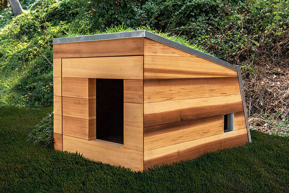 クリーンな直線と緑の屋根。「ドッグ ドリームハウス」は、家にうるさいワンちゃんのための夢の家だ。デザイン性を重視した、飼い主も羨むゆるやかな傾斜の屋根の木造の犬小屋。サイドについたスロープから芝生の屋根へ上ると、動きを検知して作動する水飲みシステムがあり、ワンちゃんが好きな時に水を飲むことができる。通路の下にはおもちゃやおやつを収納できる引き出しもついている。小屋の中はクッション性のあるゴム敷きのフローリングとソーラーパワーファンで、ワンちゃんがいつでも快適に休める。