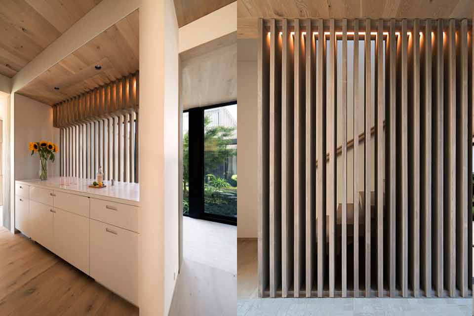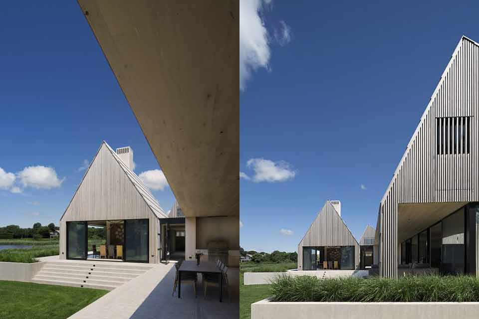 近くに海が見える「ジョルジカ・コーブ・ハウス」は、イースト・ハンプトンのヴァナキュラー建築と素朴な農家の建物を融合した住宅だ。切妻屋根の建物が連なったようなデザインは、何十年もの間使われている古びた納屋のイメージを再現している。外壁には大きな杉のこけら板を使い、この土地の伝統的なファサードで仕上げたエクステリア。インテリアは棟ごとに分かれ、2人用の落ち着いた住居からゲストが来た広々としたリトリートとさまざま。中央の中庭を囲むように部屋間がつながっており、スライド式ガラスドアを開けると海岸を見下ろすプールへと出られるようになっている。
