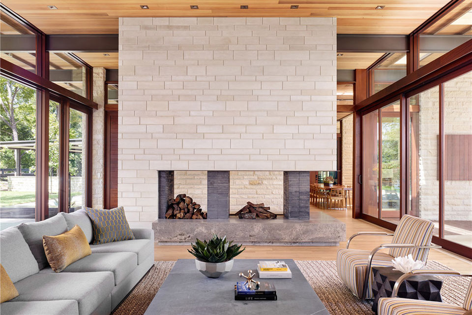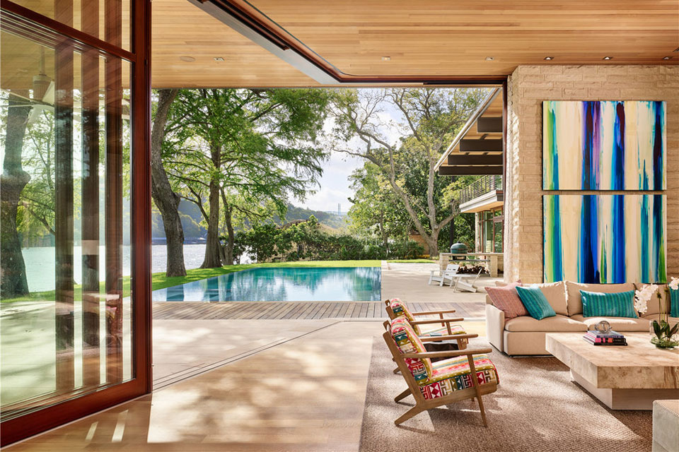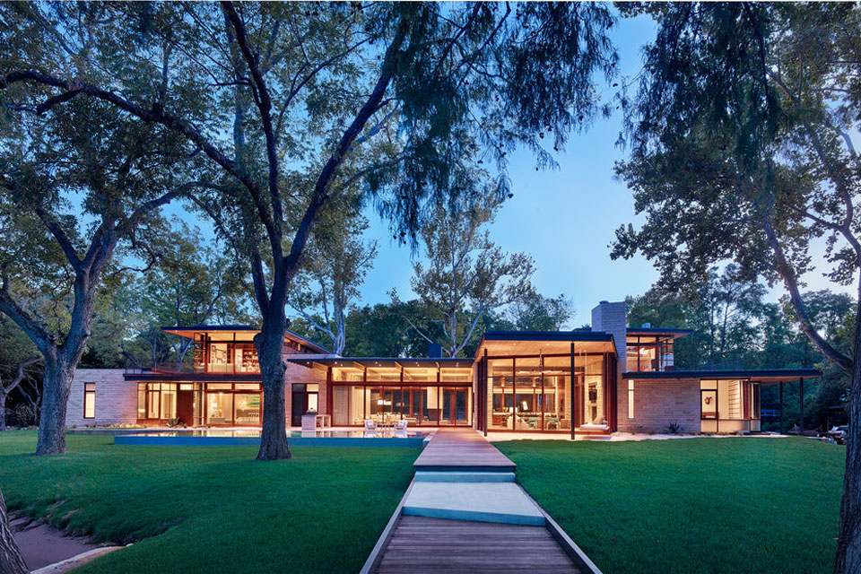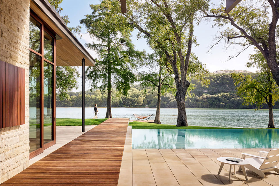 高くそびえ立つプラタナスやサイプレス、ピーカンの木立に囲まれた「レイク・オースティンハウス」は素朴な素材とコンテンポラリーなデザインが融合している。ガラスと石灰の壁が組み合わさるようなモダンなシルエットは、木のアクセントが温かみのあるコントラストを生み出している。内部はオーク、マホガニー、スギで統一されており、静かなキャビンの美しさを醸し出す。ガラスパネルはインテリアと自然の風景を一体化させ、リビングエリアからウッドウォークデッキへ出れば、テラスやプールへと続いていく。