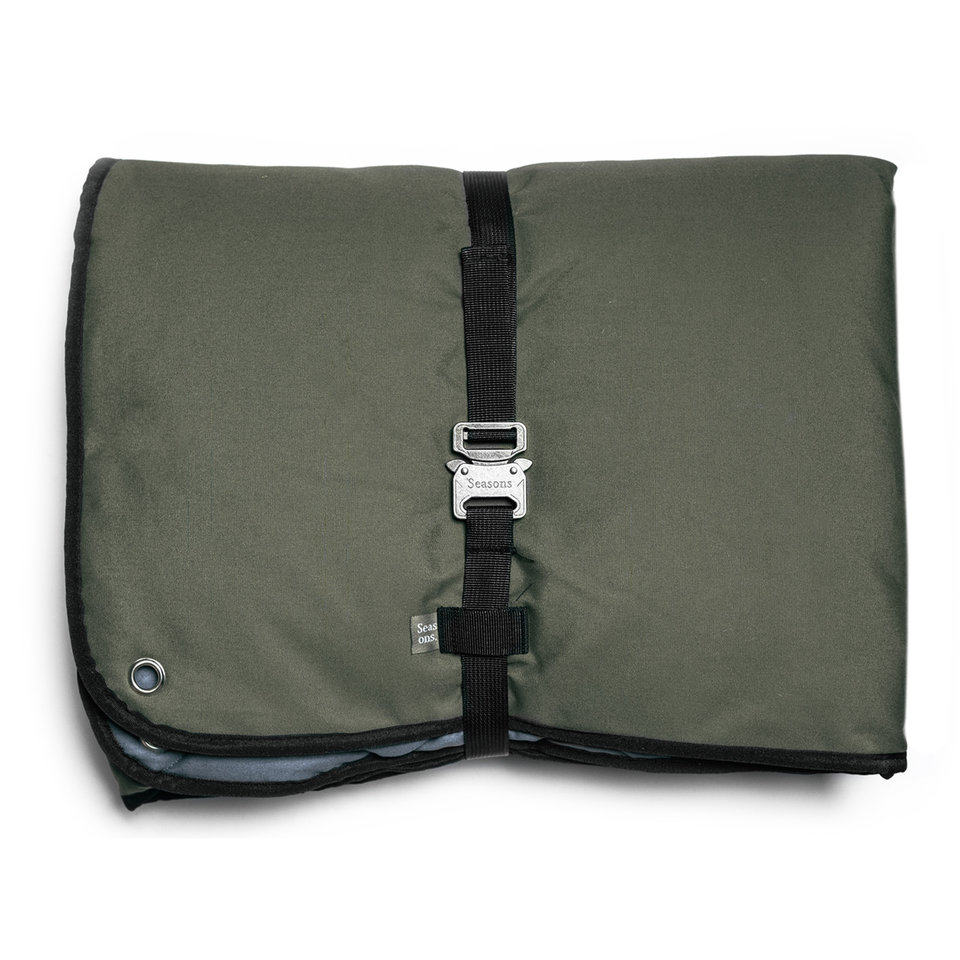 ベッドルームにも使える柔らかさと、キャンプ地でも使える素朴感。シーズンズ・ブランケットは両面使えるタイプでどちらのシーンでも使える。一番下の部分はヘビーデューティーなキャンバス地にDWRコーティングで完全防水仕様に。アウトドアでのベースマットとしておすすめだ。反対側は柔らかいキルトのコットンツイルの裏地で、肌触り抜群。ロールストラップとワンタッチで取り外しできるバックルが付いて持ち運びも楽々。角のはとめ金で地面にしっかり留められる。