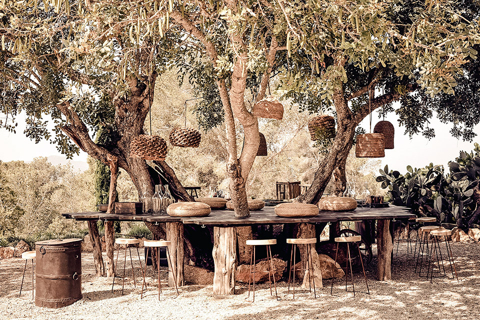 Located on a 20-acre farm surrounded by a forest of pine and citrus trees, the La Granja Ibiza is a members-only retreat in the middle of the Mediterranean. The former private residence now offers nine guest rooms, ranging from an intimate single room to suites with a private garden and terrace, featuring an ancient Iberian aesthetic with arched walls, dark wood beam ceilings and doors, and hammered iron fixtures. A short distance from the farmhouse is a guesthouse with two bedrooms, two bathrooms, lounge area, and private garden. The on-site chef works closely with the farmer and local producers to create the freshest farm-to-table meals, offered family style around the communal table. After dinner drinks are served at the base of a mature carob tree, where you can indulge in an assortment of mezcal-based cocktails and organic wines.