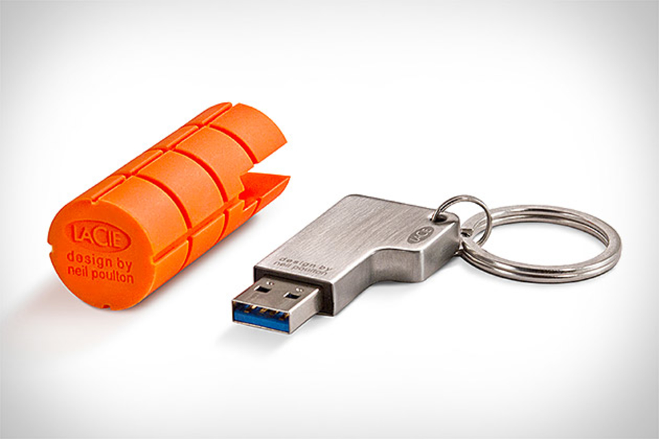 Just because it's a flash drive doesn't mean it's impervious to damage. Protect your mission-critical data when traveling while storing it on a LaCie RuggedKey ($40-$70). Available in 16GB and 32GB capacities, these speedy USB 3.0 thumb drives come encased in Neil Poulton's distinctive orange rubber design, and support AES 256-bit data encryption to keep your data safe from non-external threats.