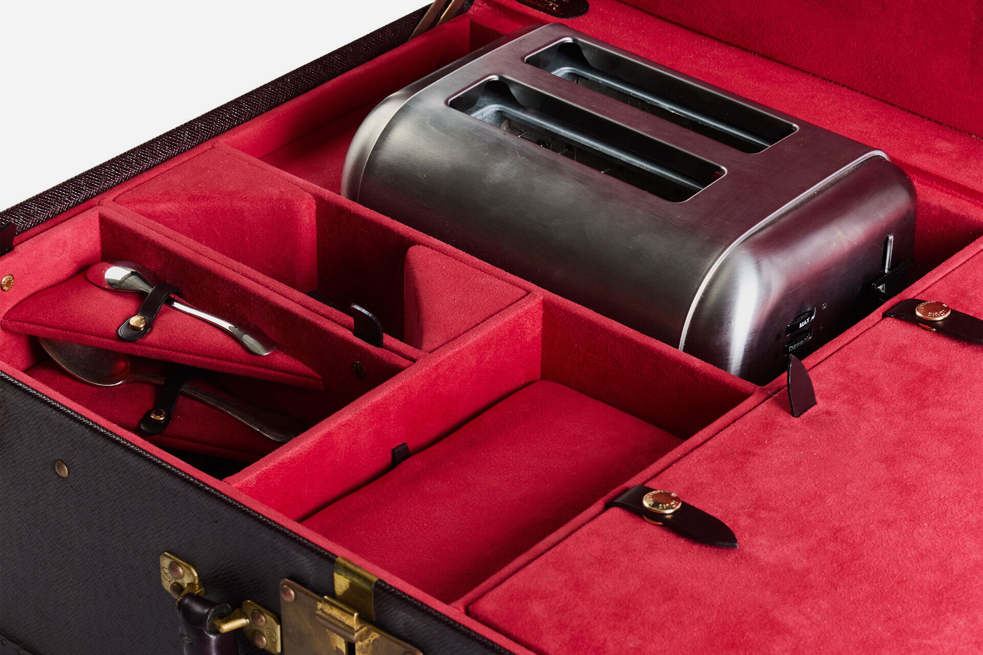 LVMH chairman Bernard Arnault commissioned this bespoke Louis Vuitton case as a personal gift for Karl Lagerfeld, the late creative director of Chanel and Fendi. Built around Lagerfeld's very specific morning ritual, the custom trunk houses an electric toaster, table linens, cutlery, and a crystal thermos. Everything Lagerfeld needed to travel with his preferred Harrys sandwich bread and toast it wherever he landed. Now the piece has surfaced on Pharrell Williams' auction house as part of a collection of objects gifted by Lagerfeld to his bodyguard and closest confidant for almost 20 years.