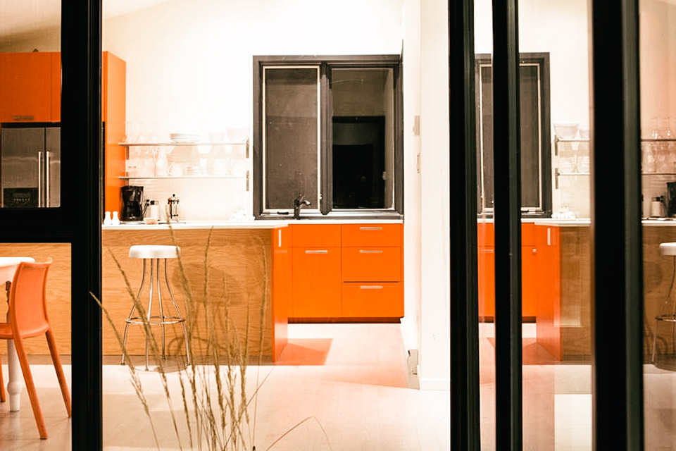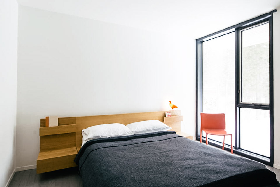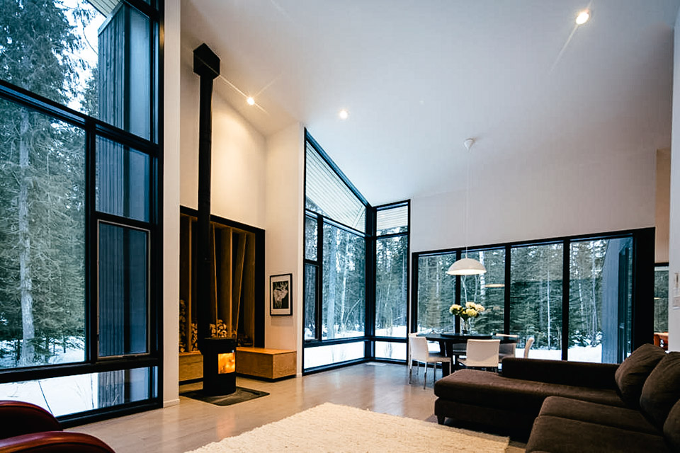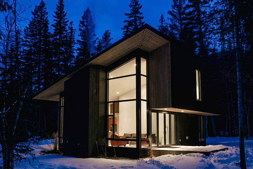 Surrounded by protected forest yet only a 20 minute drive from Golden, this Modern British Columbia Cabin is an ideal weekend getaway. Inside its sloped exterior are two bedrooms, a loft with two additional beds — great for larger groups and families — and two full bathrooms, as well as an upscale kitchen with bright orange cabinets. If the weather permits, there's a gas barbeque for outdoor cooking, a wood-burning fireplace when it doesn't, and large windows that provide 180 degree views of the surrounding woods, mountains, and river.