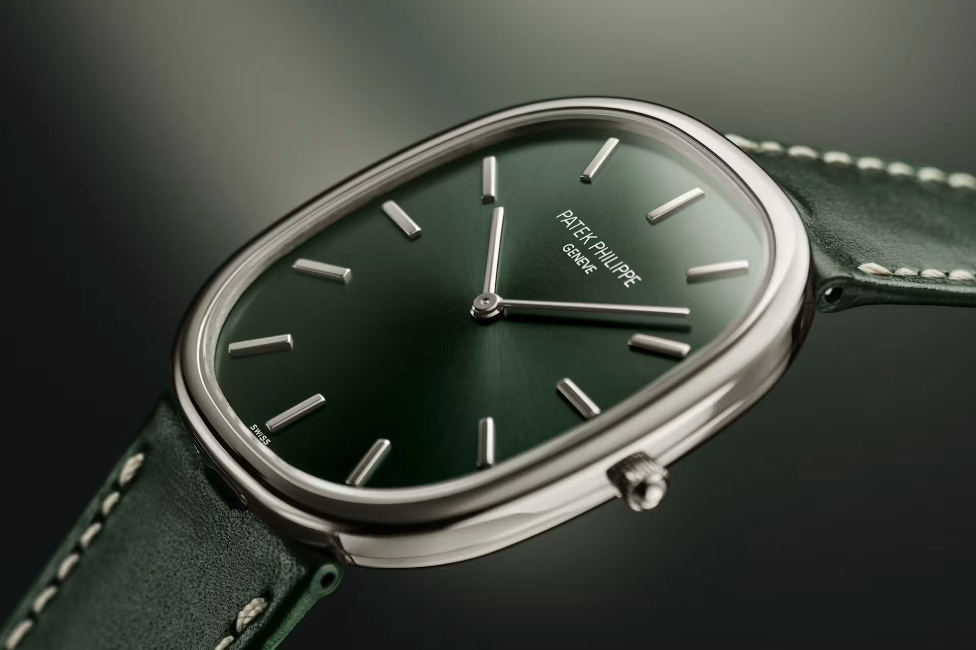 The golden ratio has guided architects and artists since ancient Greece. In 1968, Patek Philippe applied it to its iconic Golden Ellipse collection, which derives its singular elliptical case shape from the golden ratio, and the new ref. 5738G-001 is the most refined expression of that geometry yet. Unveiled at Watches & Wonders, the white gold case measures 34.5 x 39.5mm and just 5.9mm thick, making it the thinnest watch in the current Patek catalogue, with a sunburst olive green dial carrying applied white gold baton hour markers and cheveu-style hands above an 18K gold dial plate. Inside, Caliber 240, a Patek staple since 1977, runs at 21,600 vph. It packs 152 parts and 27 jewels into a 2.53mm-thick movement, and keeps the case slim via a 22K gold off-center minirotor. A shiny olive green calfskin strap with cream stitching ties the whole thing together cleanly. Some watches follow trends. The Golden Ellipse was shaping them during the 1970s and hasn't stopped since.