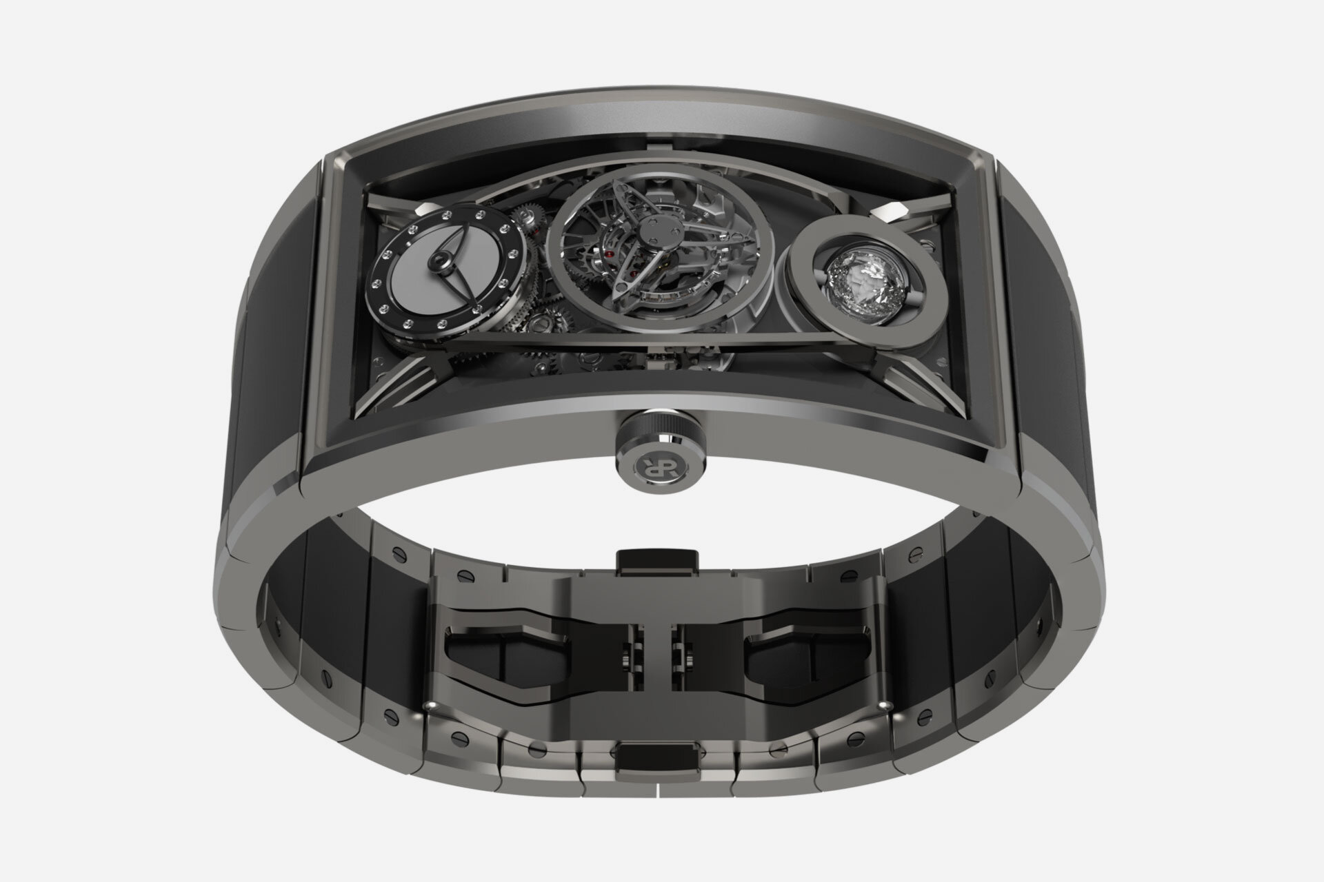 Michael Friedman has worked at Christie's and Audemars Piguet, among other horological outposts. He's now striking out on his own with the Pattern Recognition brand, and their first timepiece, the B-Theory, is just as impressive as expected. It has a 32mm wide and 52mm long curved titanium case housing a three-plane movement, with a moonphase at the top that has a 6 mm custom lab-grown diamond and a cover that opens and closes as appropriate. At the center is a flying tourbillon that's hand-wound and hand-finished, while at the bottom is a simple hours and minutes readout with white-gold hands and diamond indexes. It's finished with a quick-release strap system so wearers can choose between a hand-crafted bracelet and an assortment of different straps to match the moment.