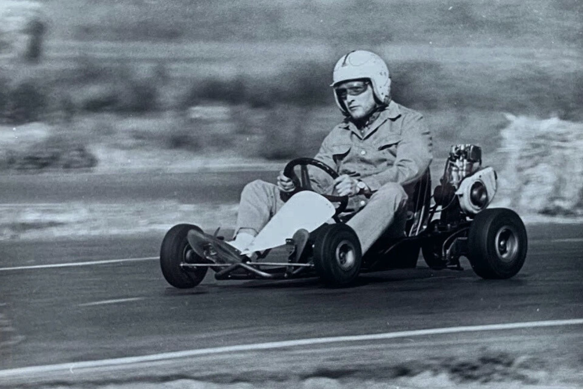 Before the Datsun 510, before Le Mans, before Newman/Haas Racing, there was a go-kart. This original vintage press photograph shows Paul Newman at speed on a kart track, helmeted and hunched over the wheel, the engine visible behind his right shoulder and the background blurred with motion. Shot in August 1962 at the Go Kart Raceway in Azusa, California, the print was distributed through Globe Photos, New York, with a Bulls Presstjänst Stockholm syndication stamp for single-use publication in Sweden. Newman wouldn't begin serious racing until 1972. And he wouldn't finish second overall at Le Mans for another seven years after that. This was just the itch.